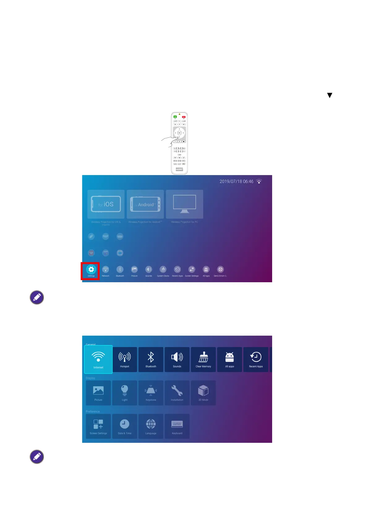 To access the Settings menu, in the BenQ Launcher home screen press the down button