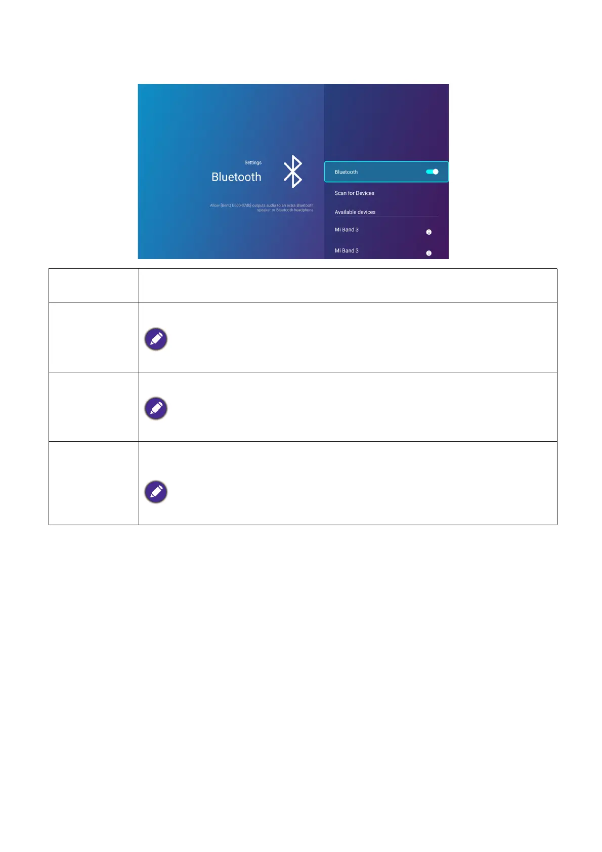 Lists the available Bluetooth devices which the projector can pair and