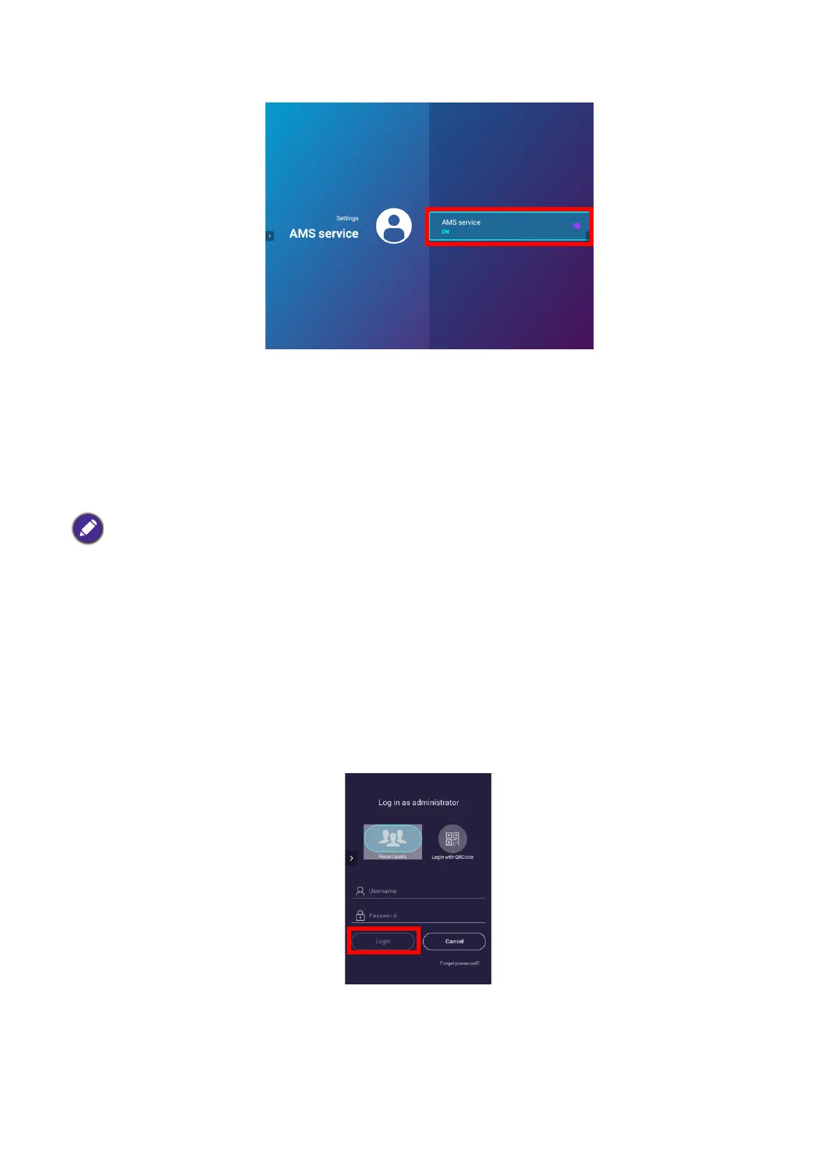 After enabling the AMS function a Log in as administrator window will pop-up. To bind an