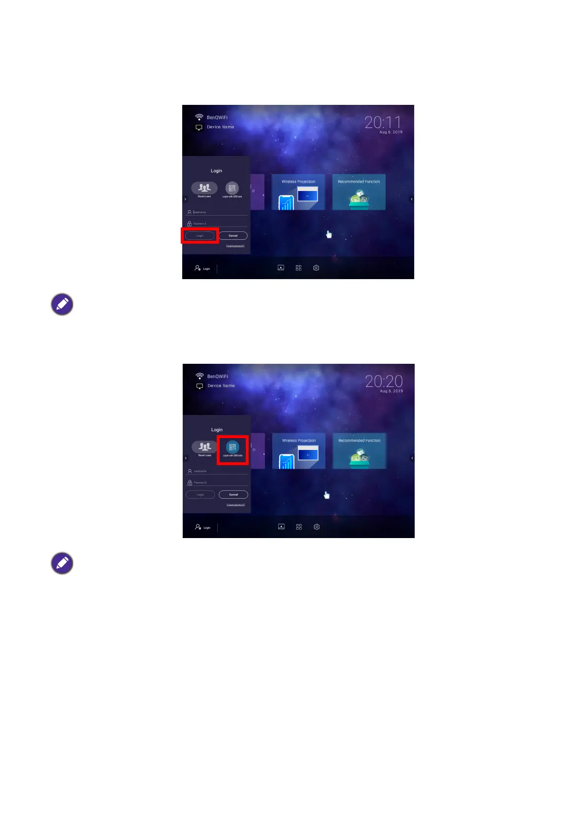 • Select Login with QR Code in the Login window and press OK. Scan the QR code that