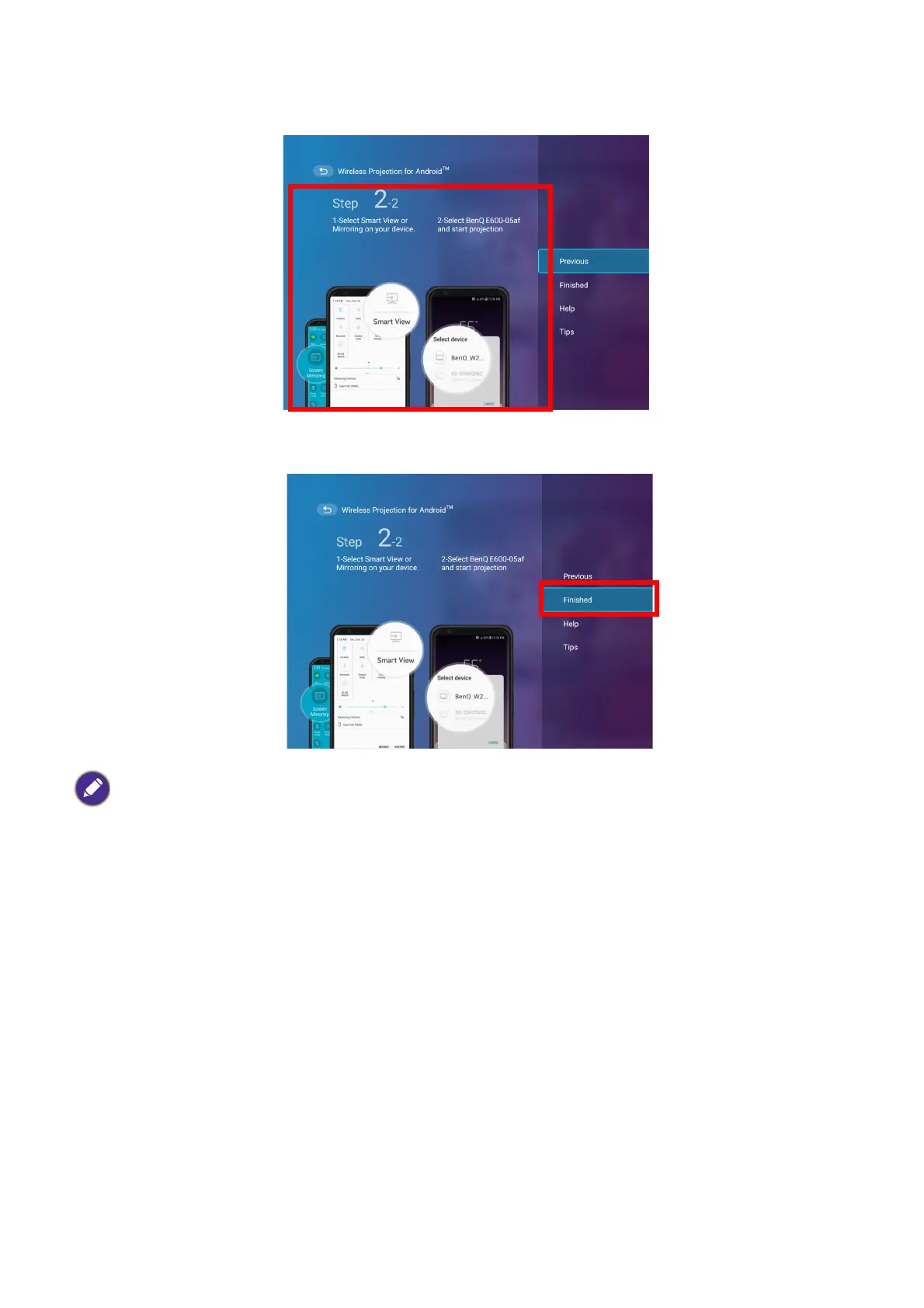5. Select Finished on the Wireless Projection for Android™ menu to finish the tutorial and