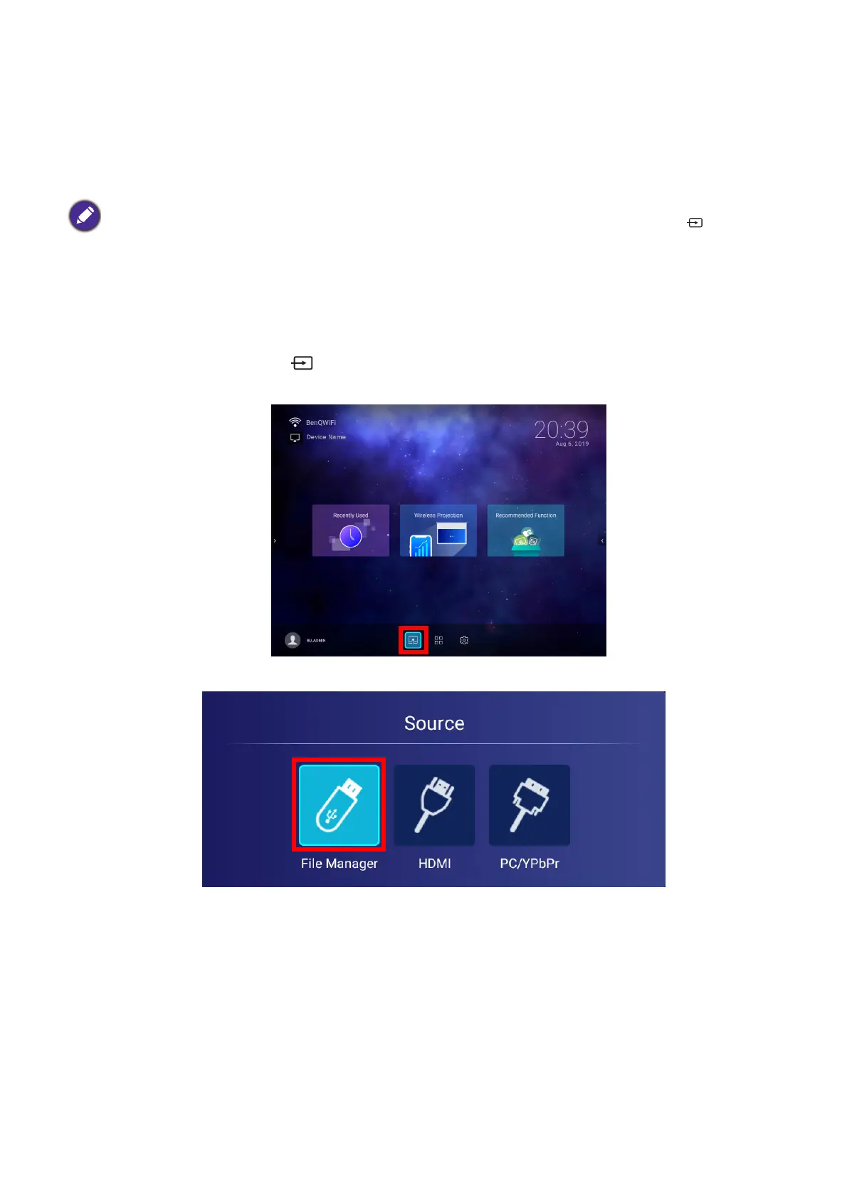 source, you must first return to the BenQ Launcher interface by pressing the source button