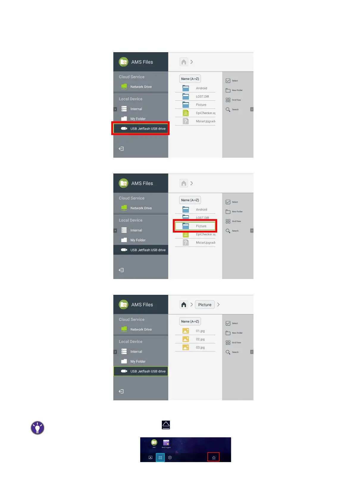 4. The AMS Files app will launch. Select the flash drive where the media file you want to play