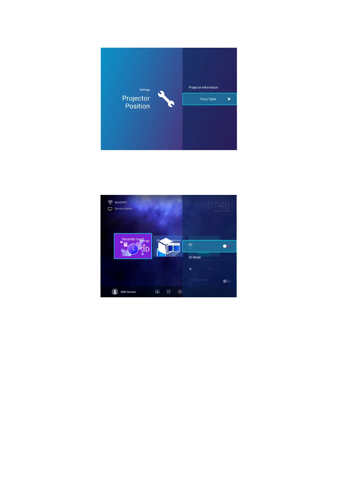 The options available for the Projector Position settings menu are the same as the options