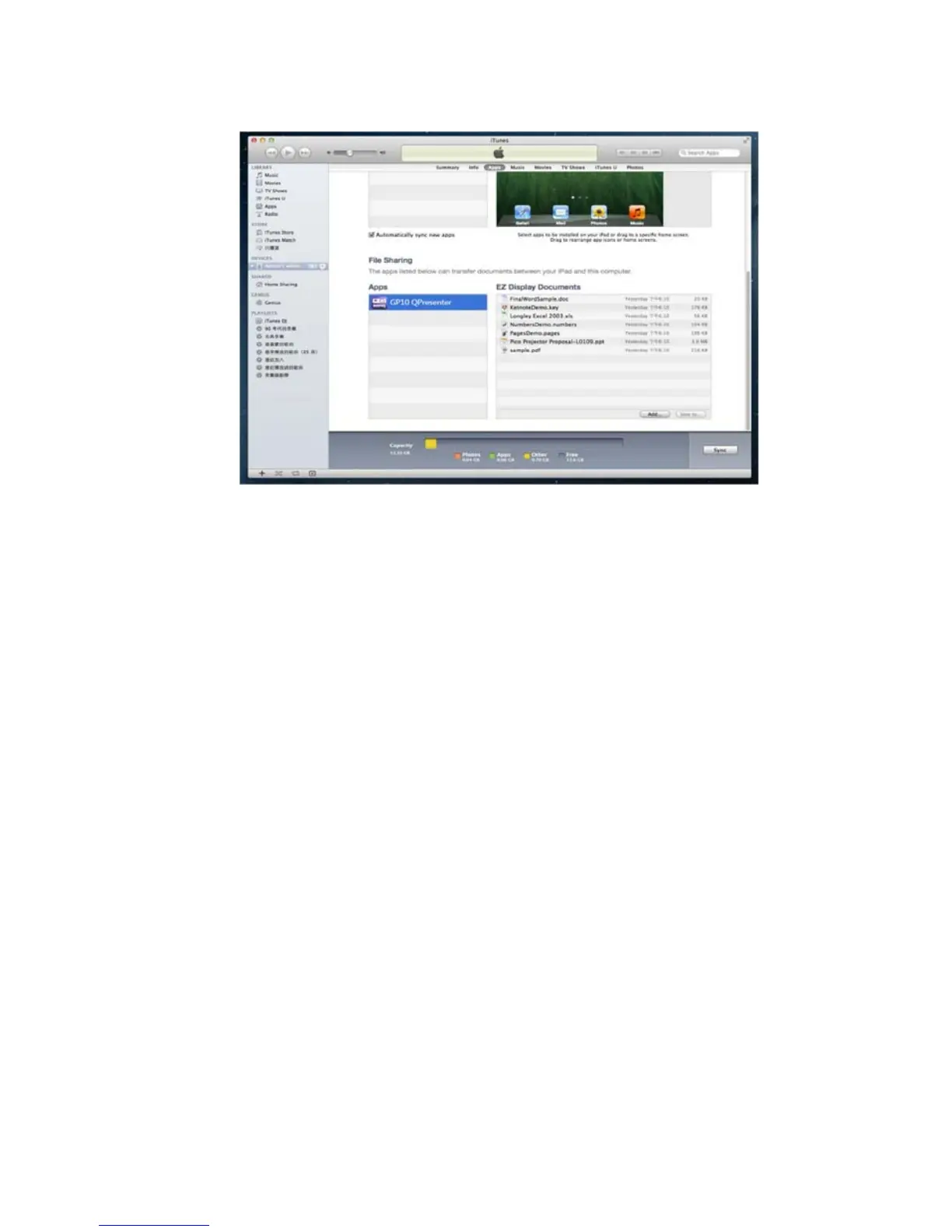 4. Connect your iPhone or iPad to NB/PC. Open iTunes and sync the documents from
