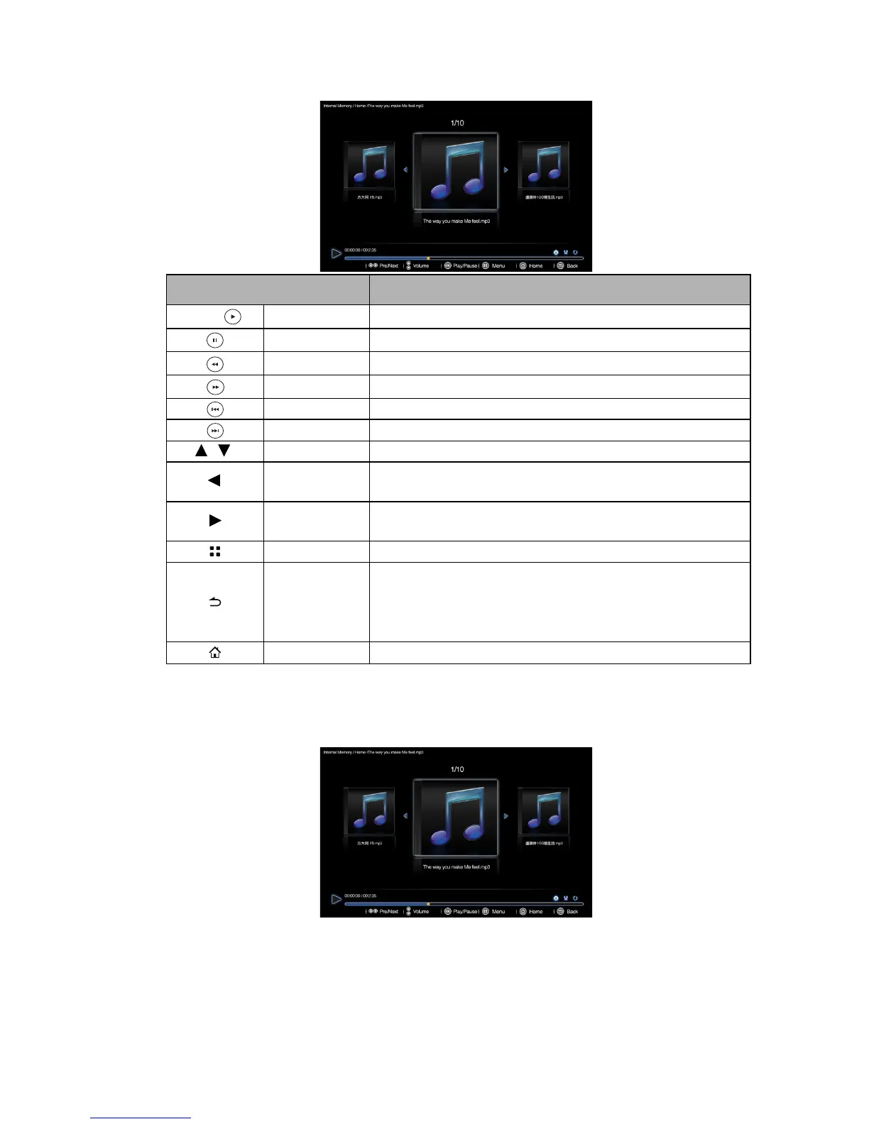 The music player pop-up menu provides an on-screen display (OSD) for adjustments when