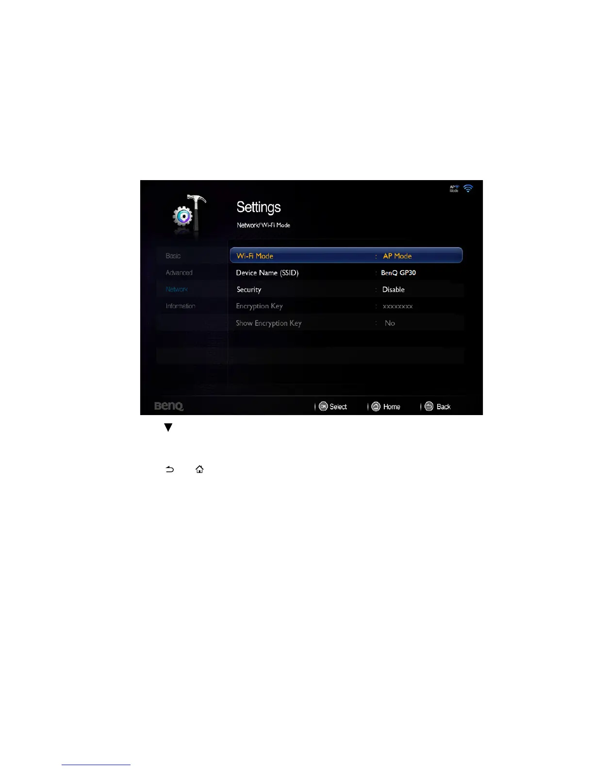 1. Go to Settings> Network> Wi-Fi Mode, press OK and a pop-up menu appears.