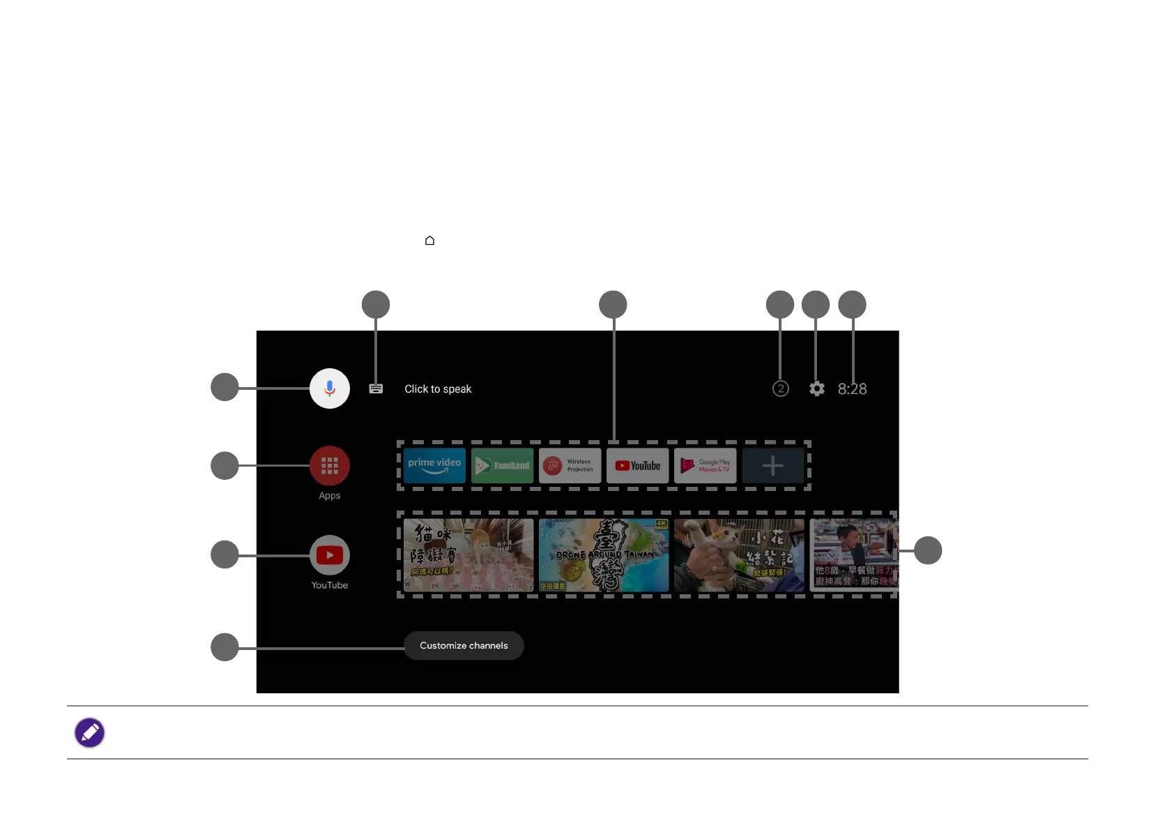 Upon initial startup or when the input source is set to ATV the projector will display the Android TV interface. If the projector is projecting from a