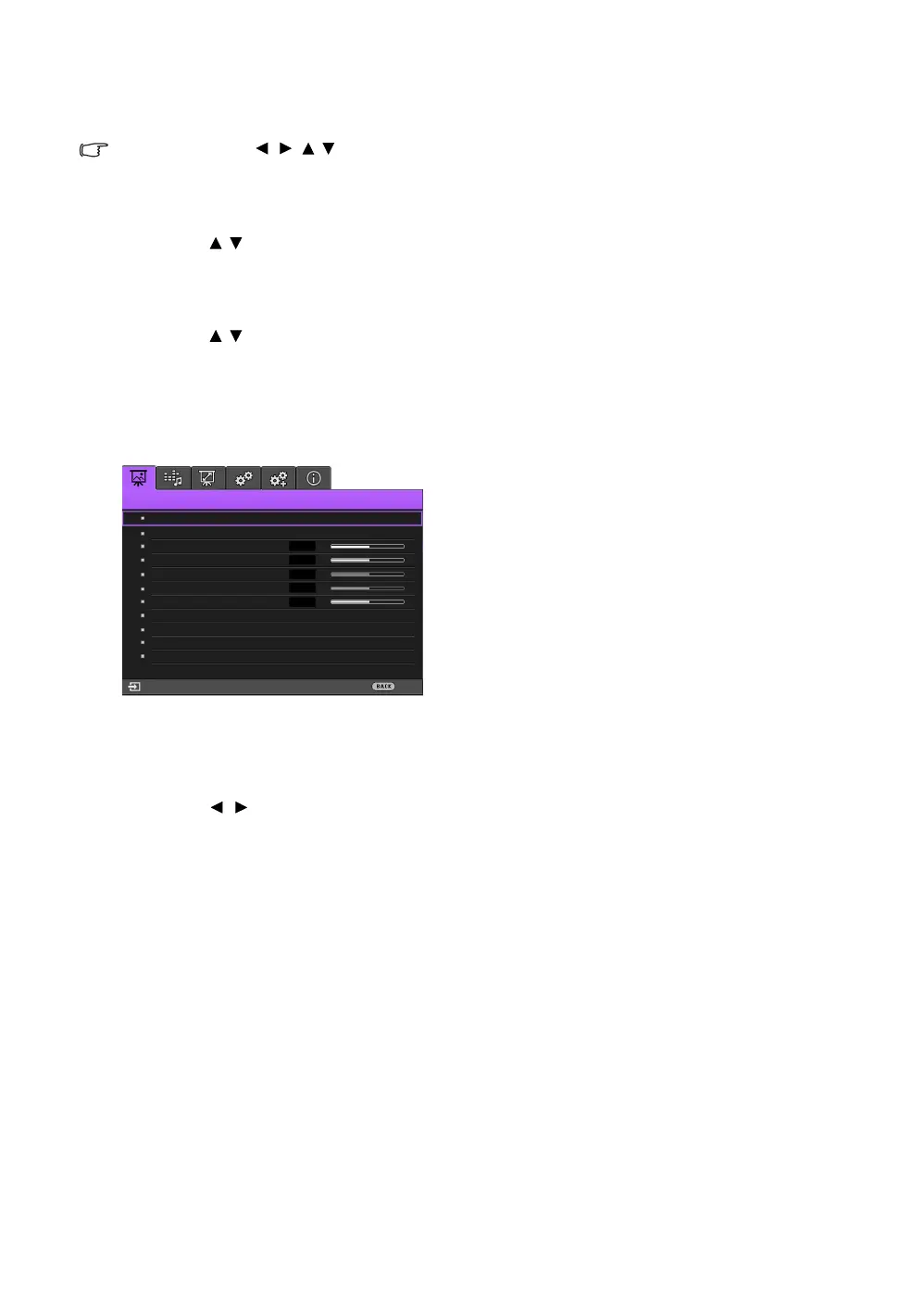 Use the arrow keys ( / / / ) on the projector or remote control to move through the menu items, and