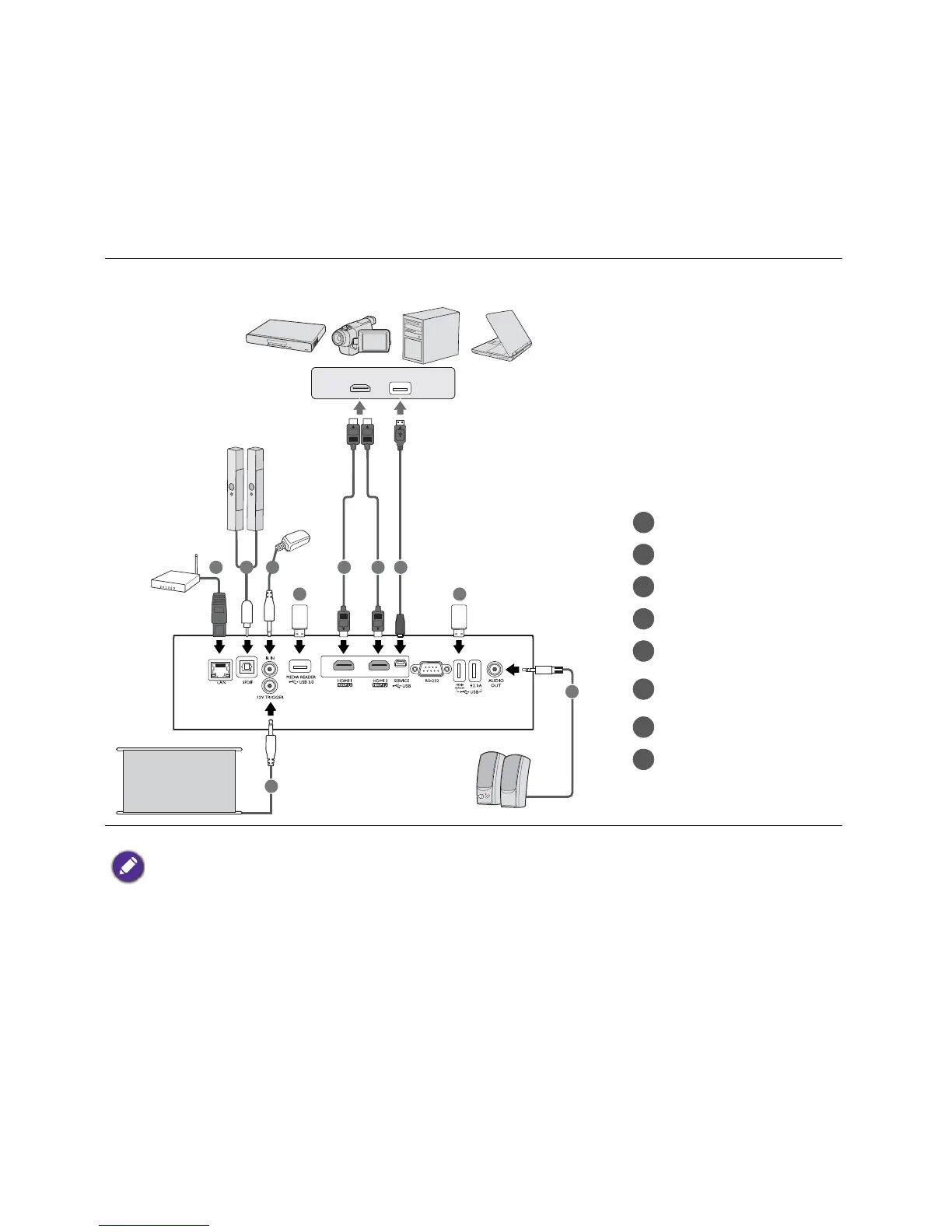 • The connection illustrations are for reference only. The rear connecting jacks available on the projector vary with