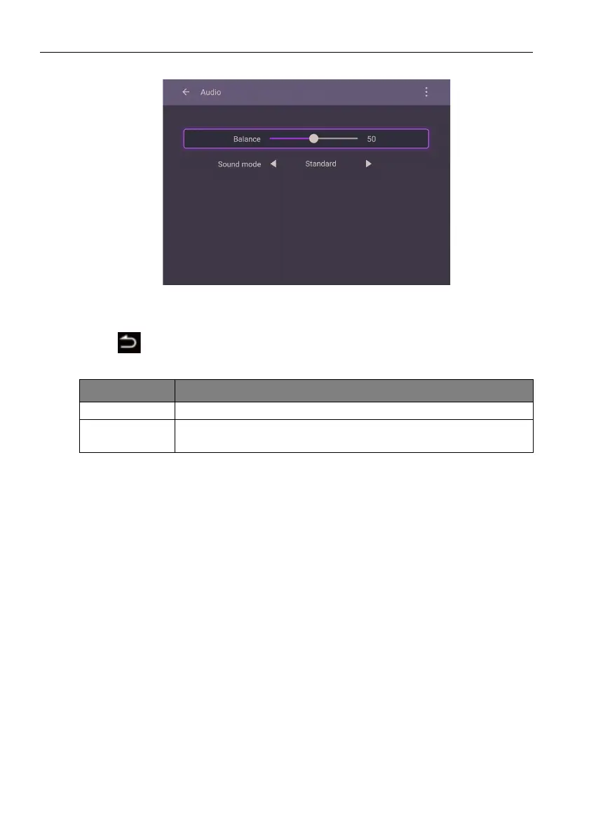 Balance Adjusts the sound balance of the audio output (0 to 100).