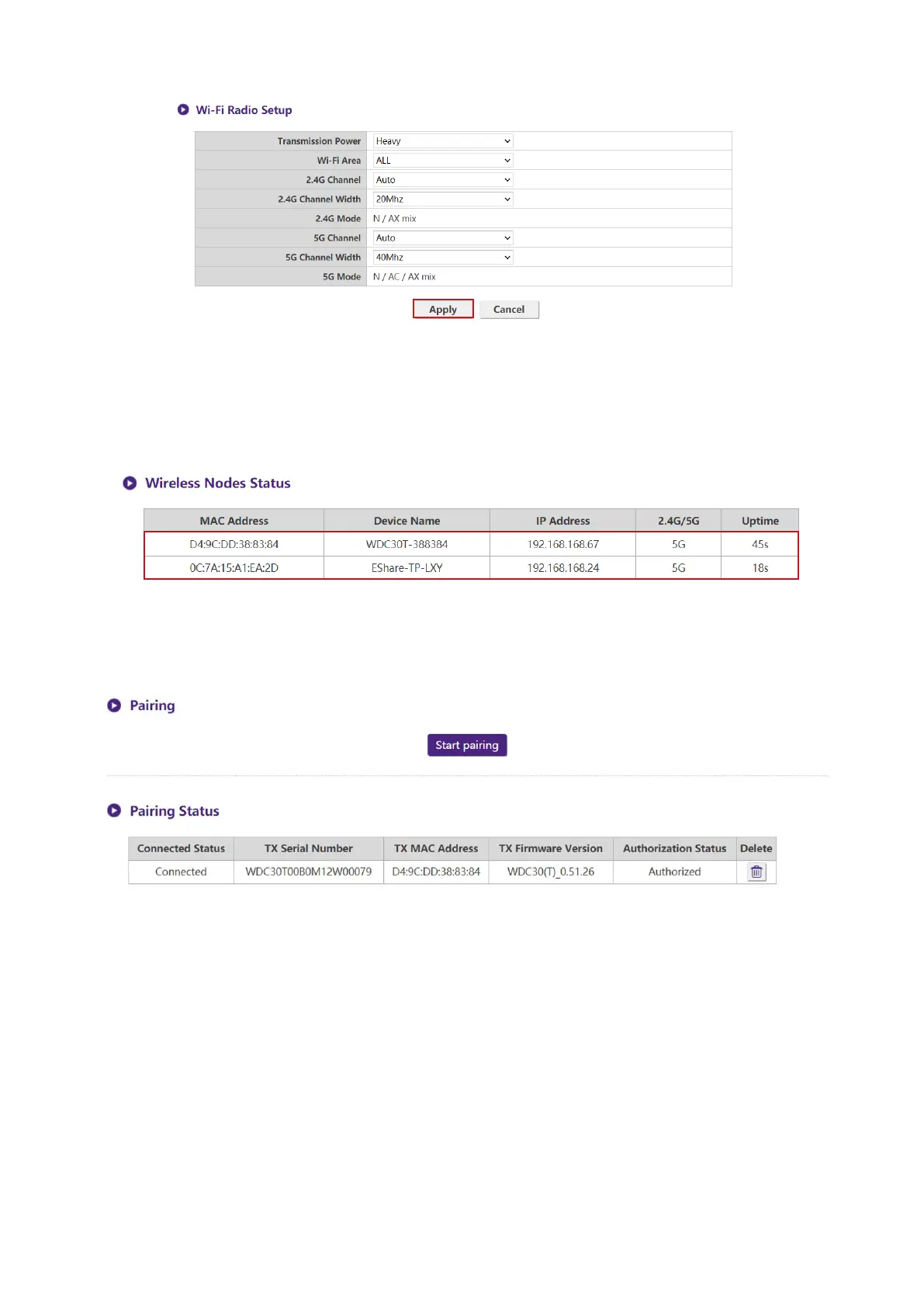 The Wireless Nodes Status sub-menu lists all the devices connected to the Host via Wi-Fi