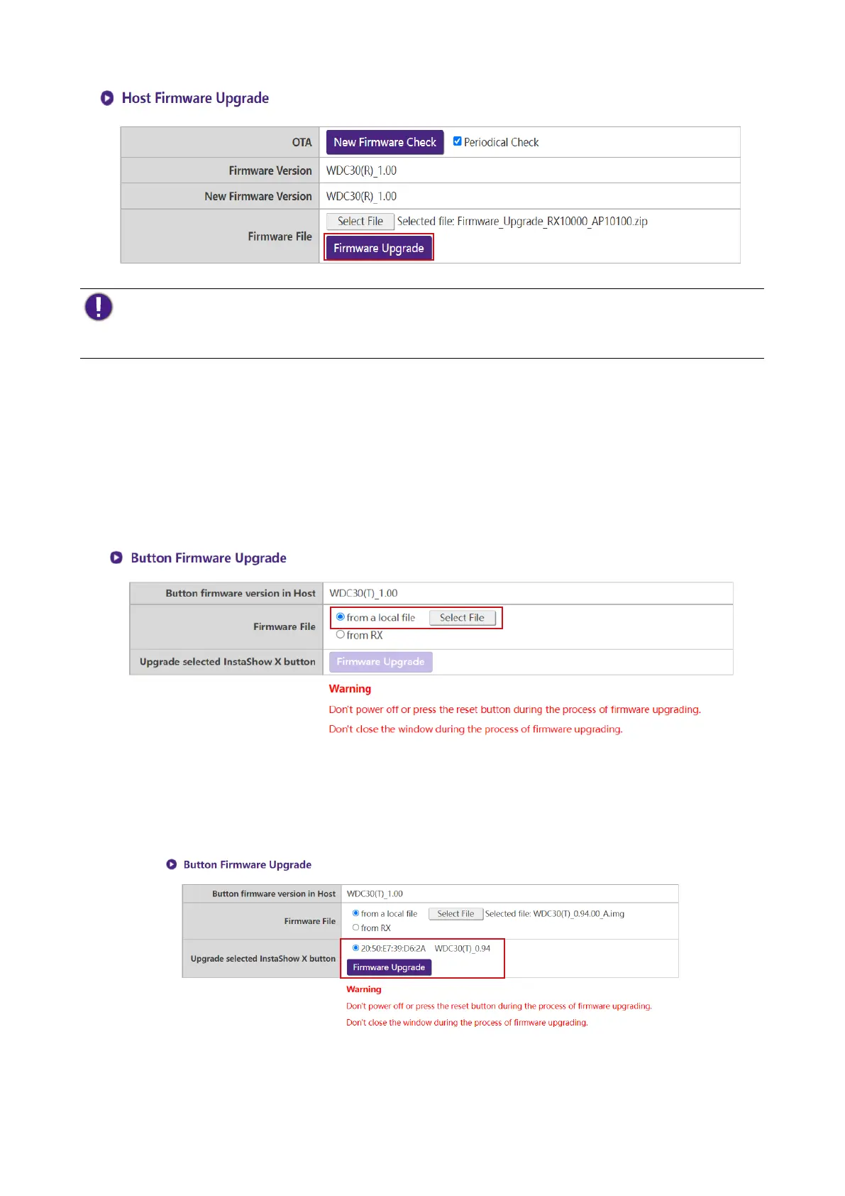 Failure to follow these warnings will result in rmware upgrade failure and subsequent product failure.