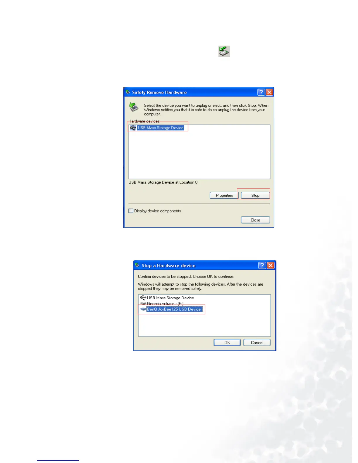 USB Mass Storage Device in the dialog box and press Stop.