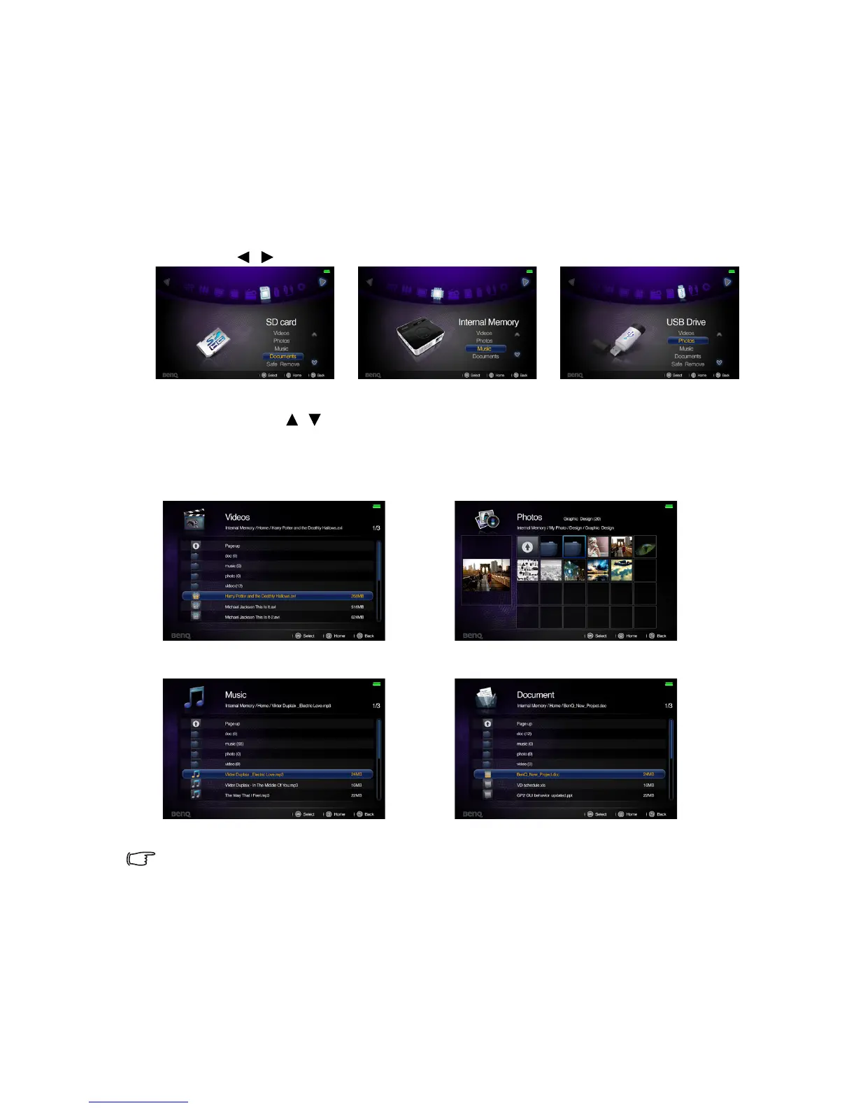 The projector can display files saved in internal memory or external storage like an SD