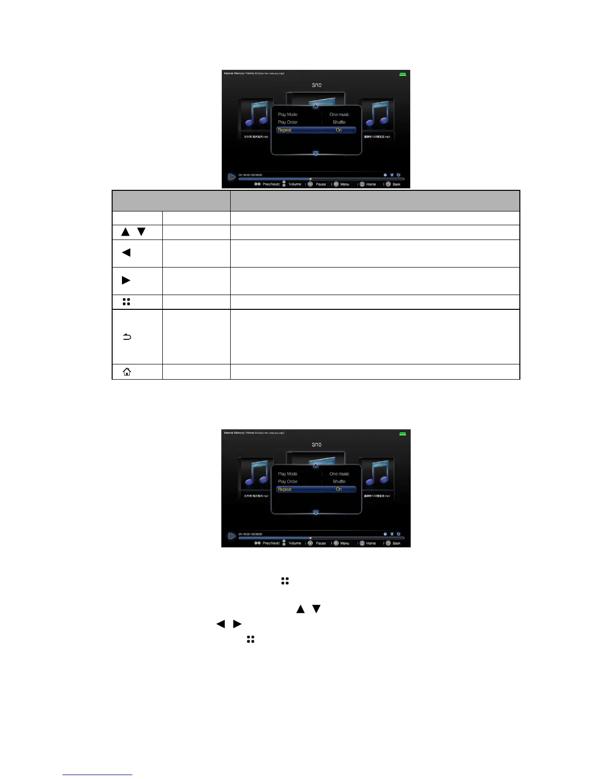 The music player pop-up menu provides an on-screen display (OSD) for adjustments when