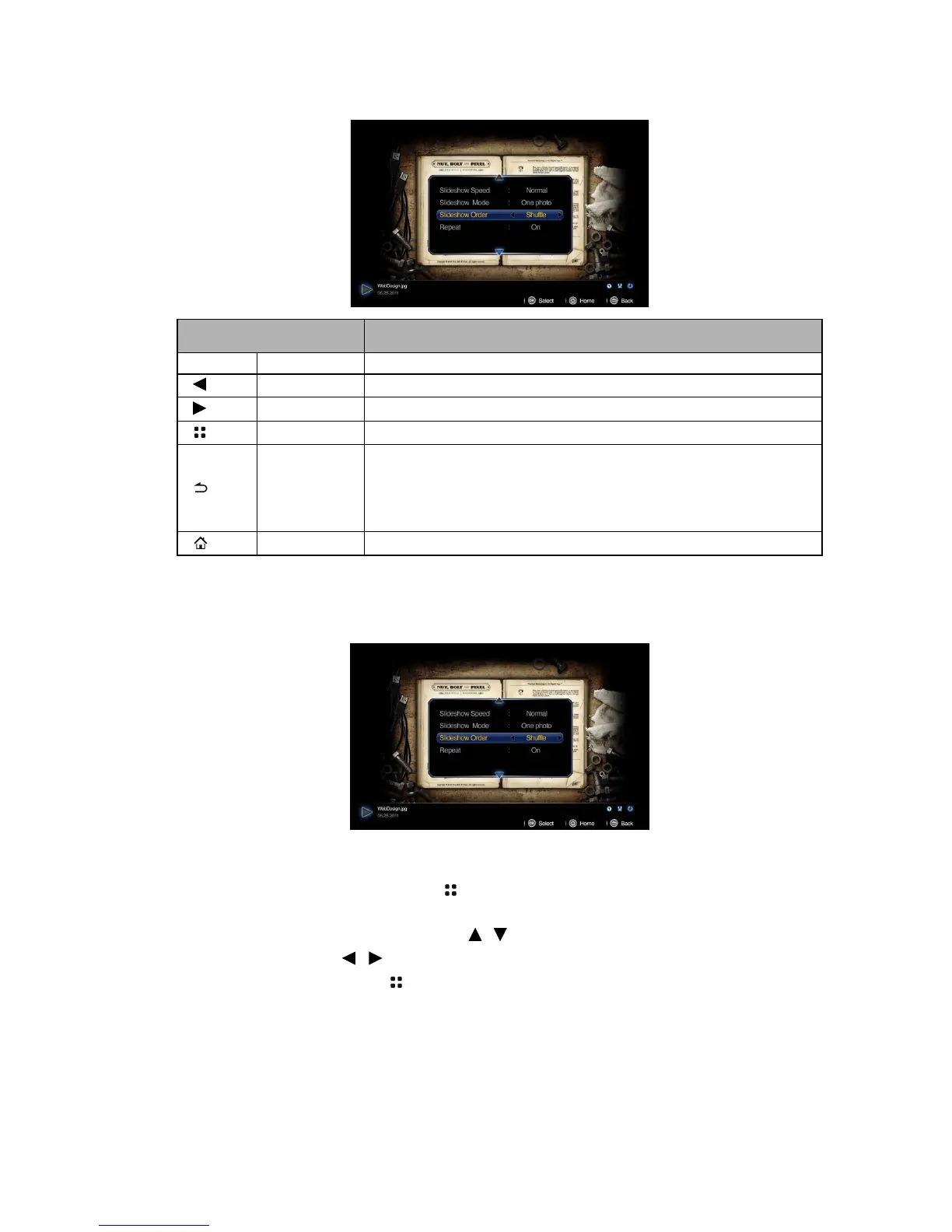 OK Play/Pause Plays or pauses a slideshow.