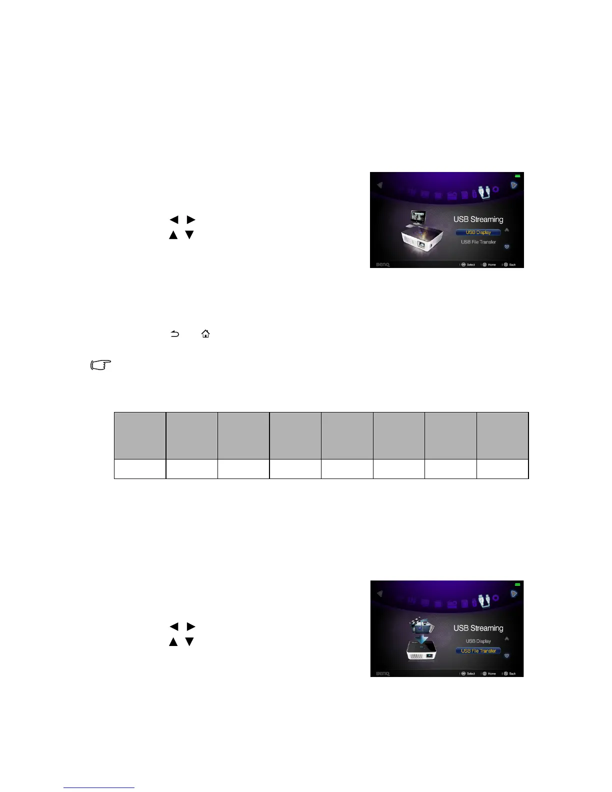 The projector supports USB streaming for USB display and USB file transfer.