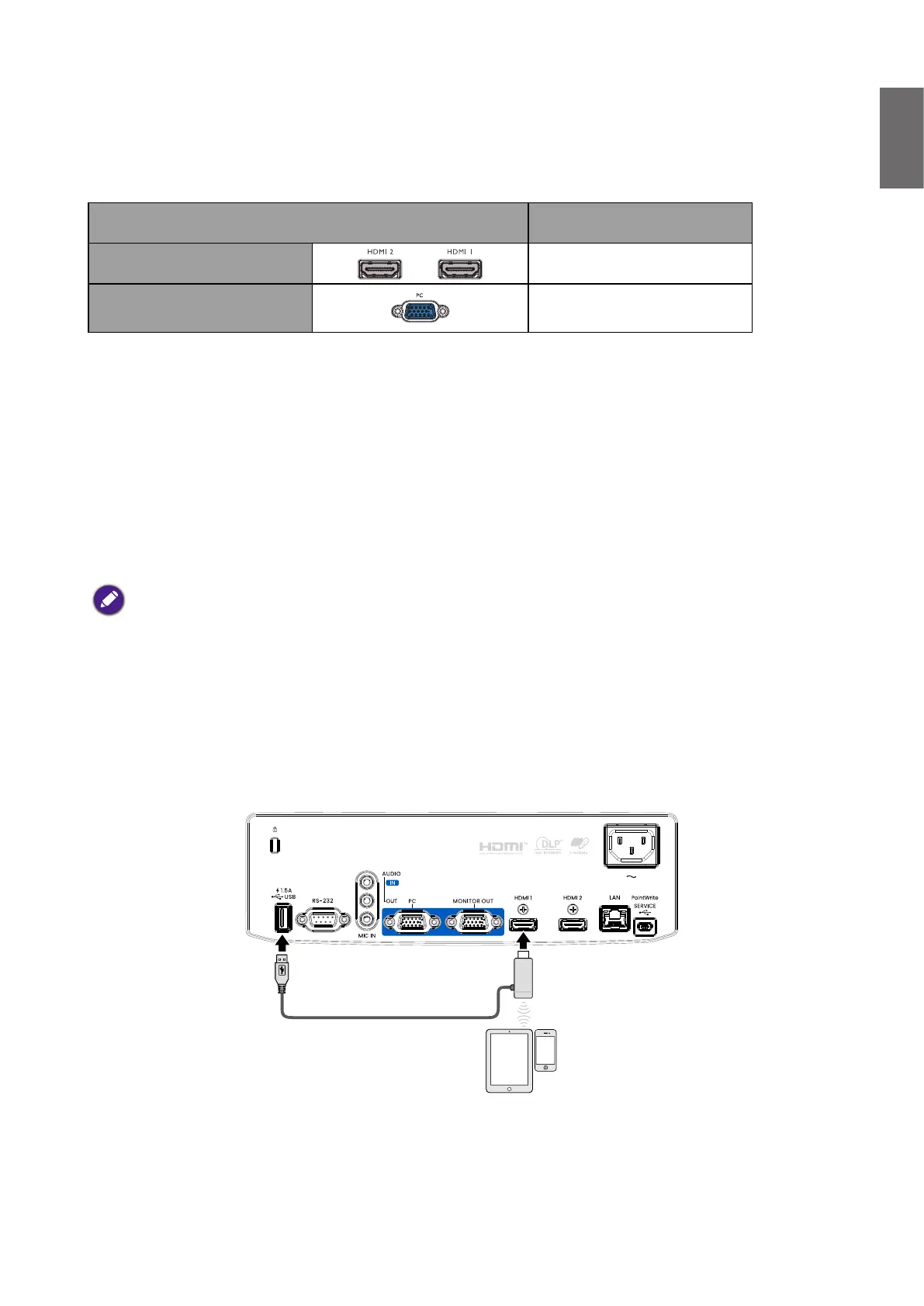 • Connect the dongle to HDMI 1 or HDMI 2 and USB TYPE-A ports on the projector and switch