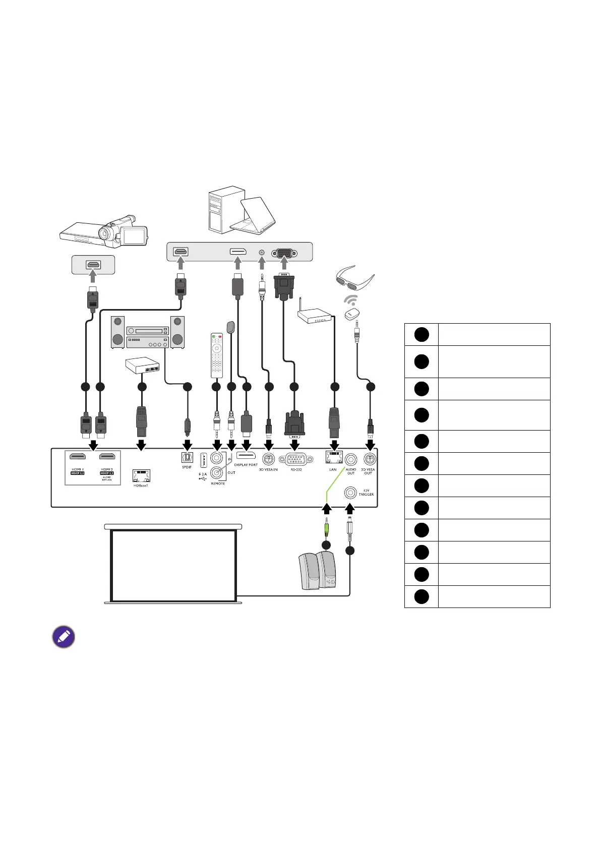 • In the connections above, some cables may not be included with the projector (see Shipping contents on
