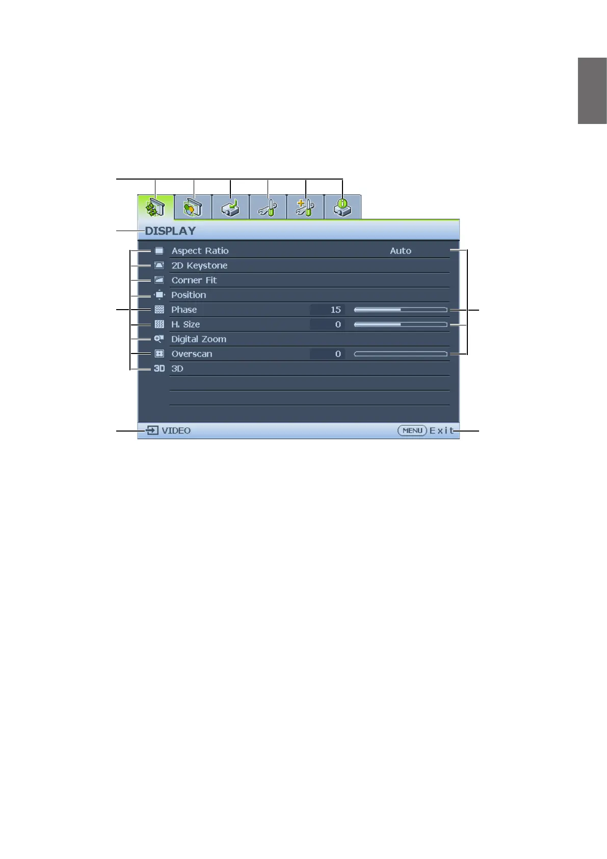 Available menu items may vary depending on the connected video sources or specied settings.