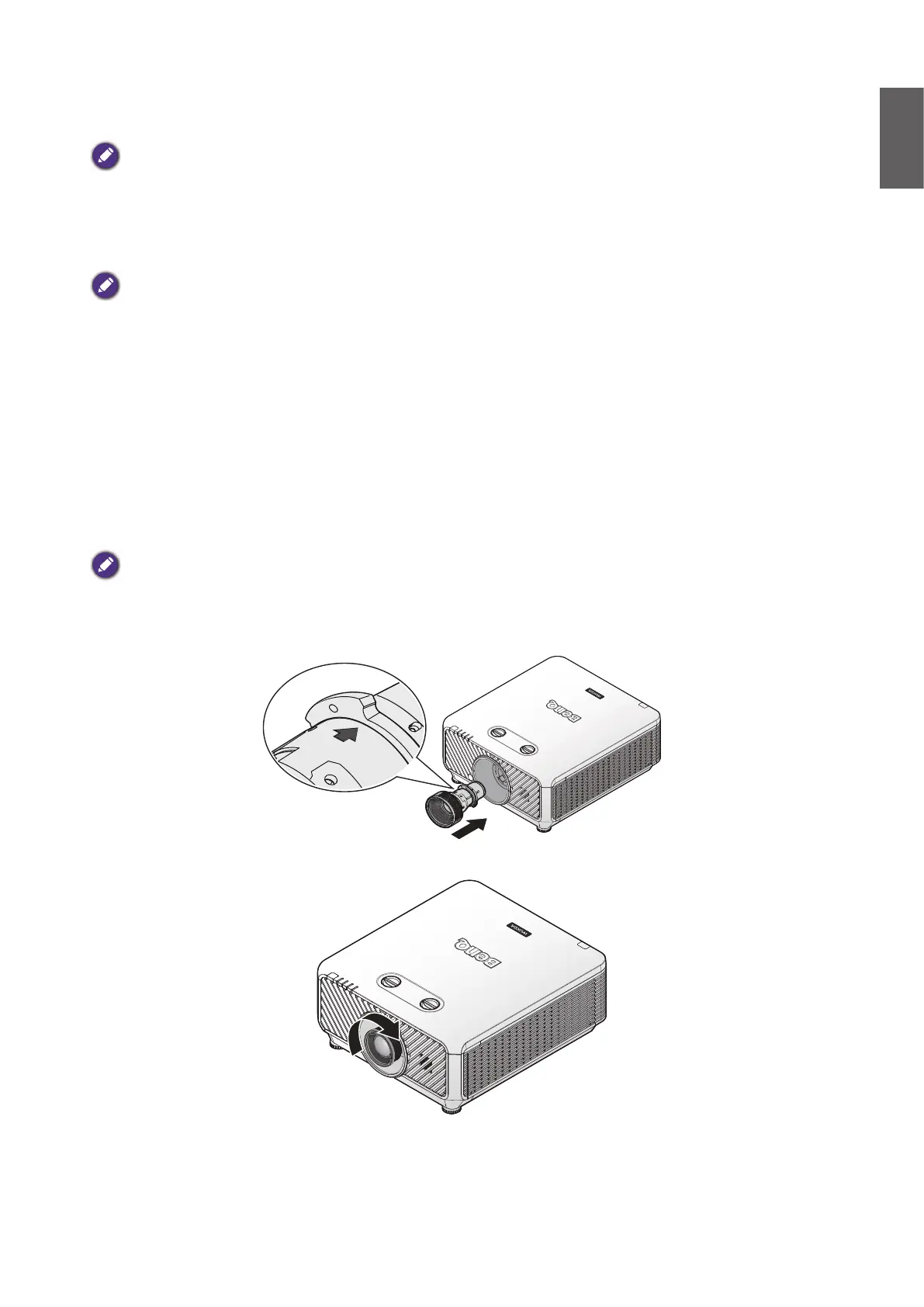 • Before removing or installing the lens, be sure to turn off the projector, wait until the cooling fans stop, and turn off