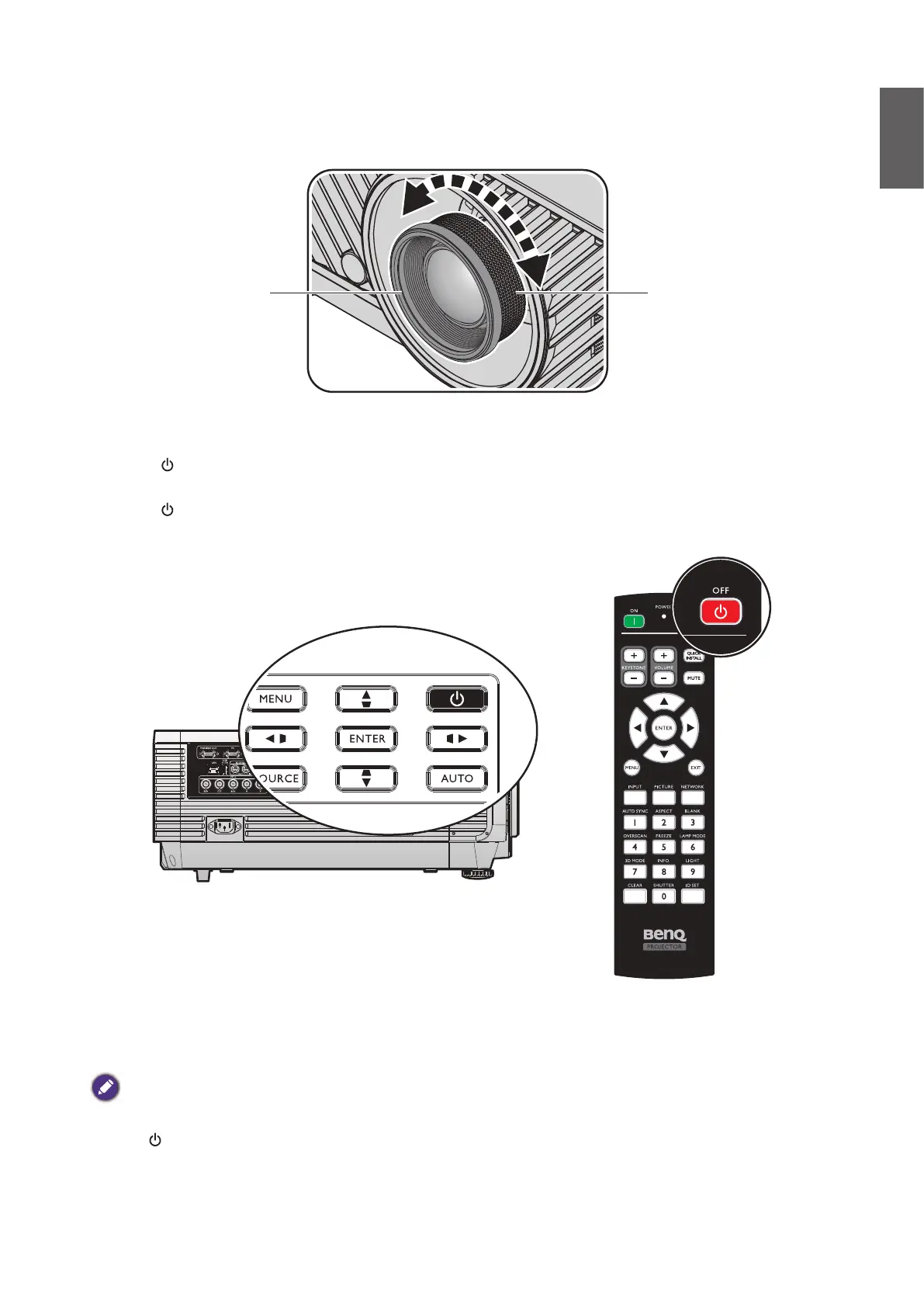 • Press POWER or ON again to start the projector after the POWER indicator light turns orange.