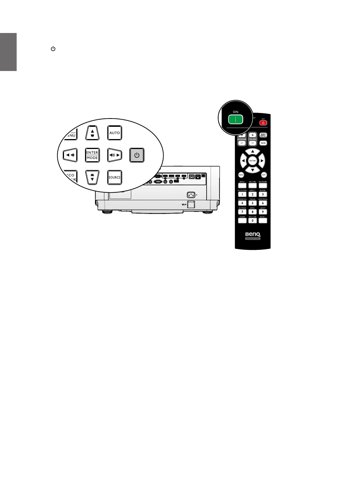 Press POWER on the projector or ON on the remote control to start the projector and