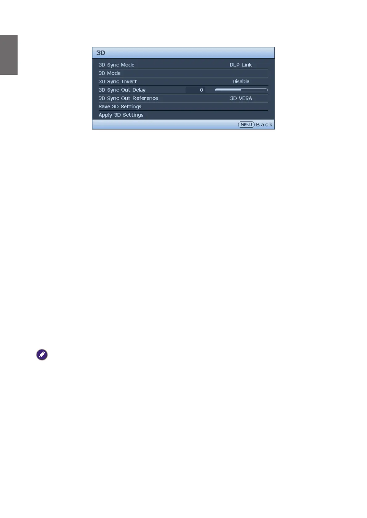 to select the 3D sync mode. The options are DLP Link and VESA 3D.