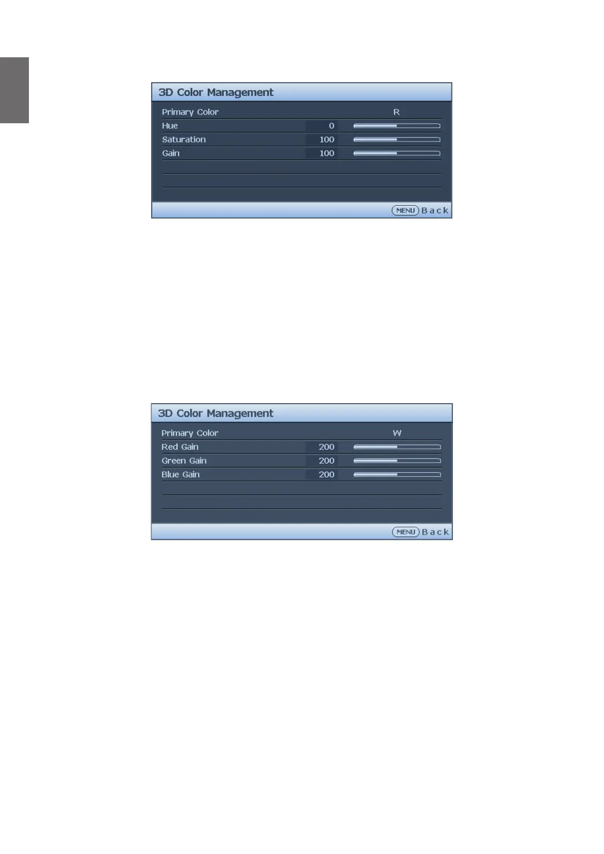 • When Primary Color Select White, Adjusting Red Gain/Green Gain/Blue Gain.