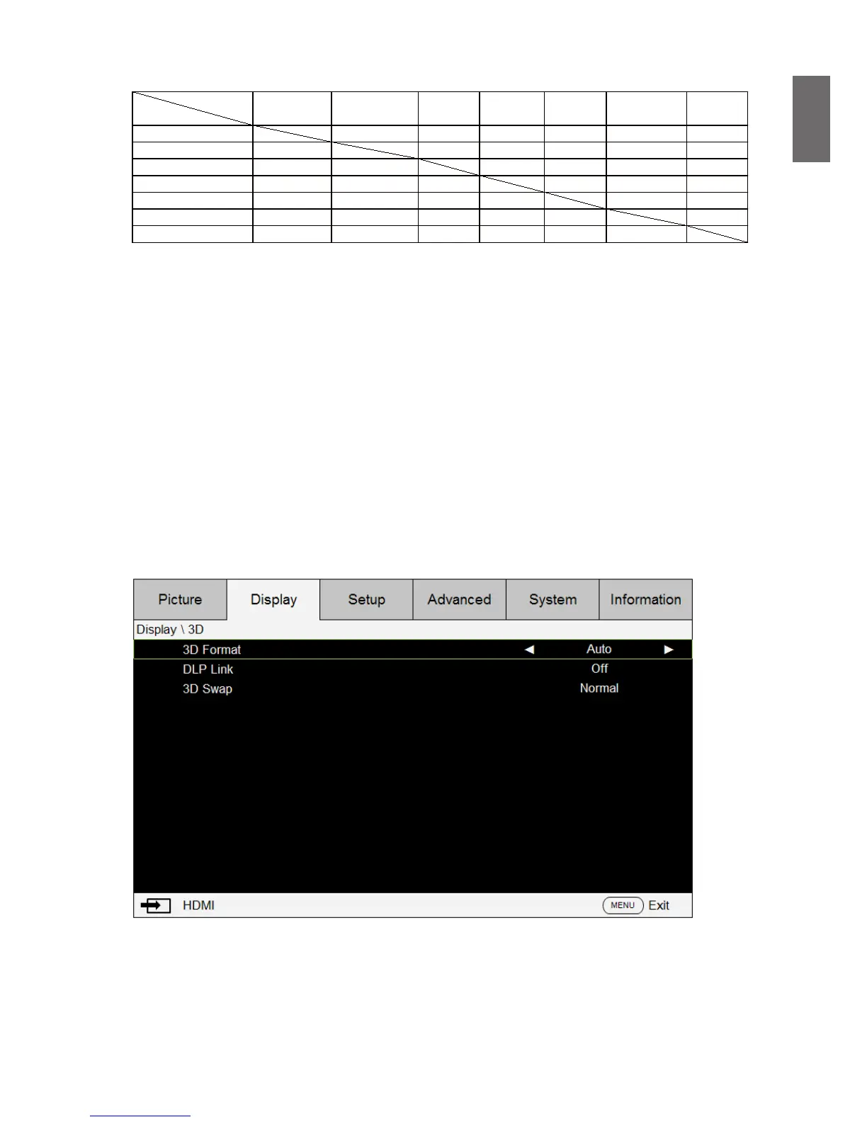 Off: Disable 3D display mode. 3D mode is enabled once Auto, Side by Side, Top/Bottom or