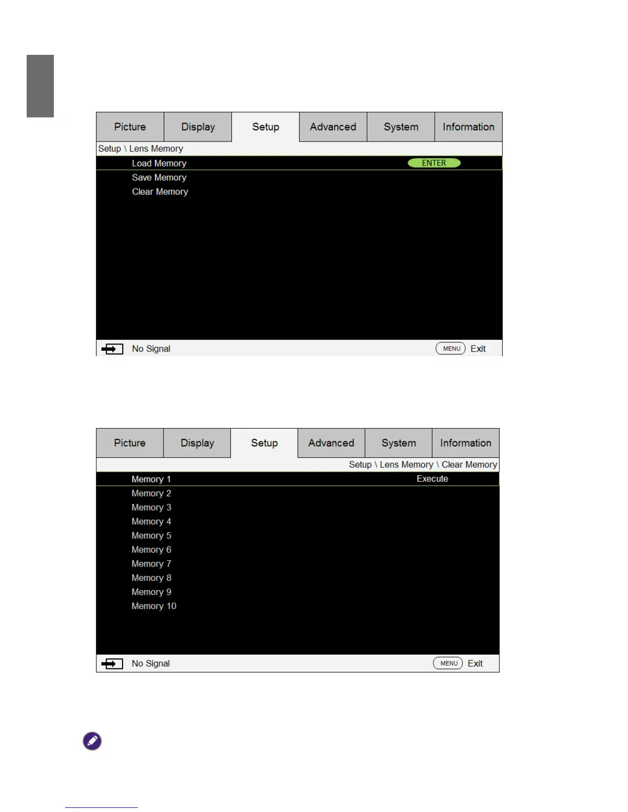 Save Memory: Edit memory name and save current memory settings including lens shift, zoom