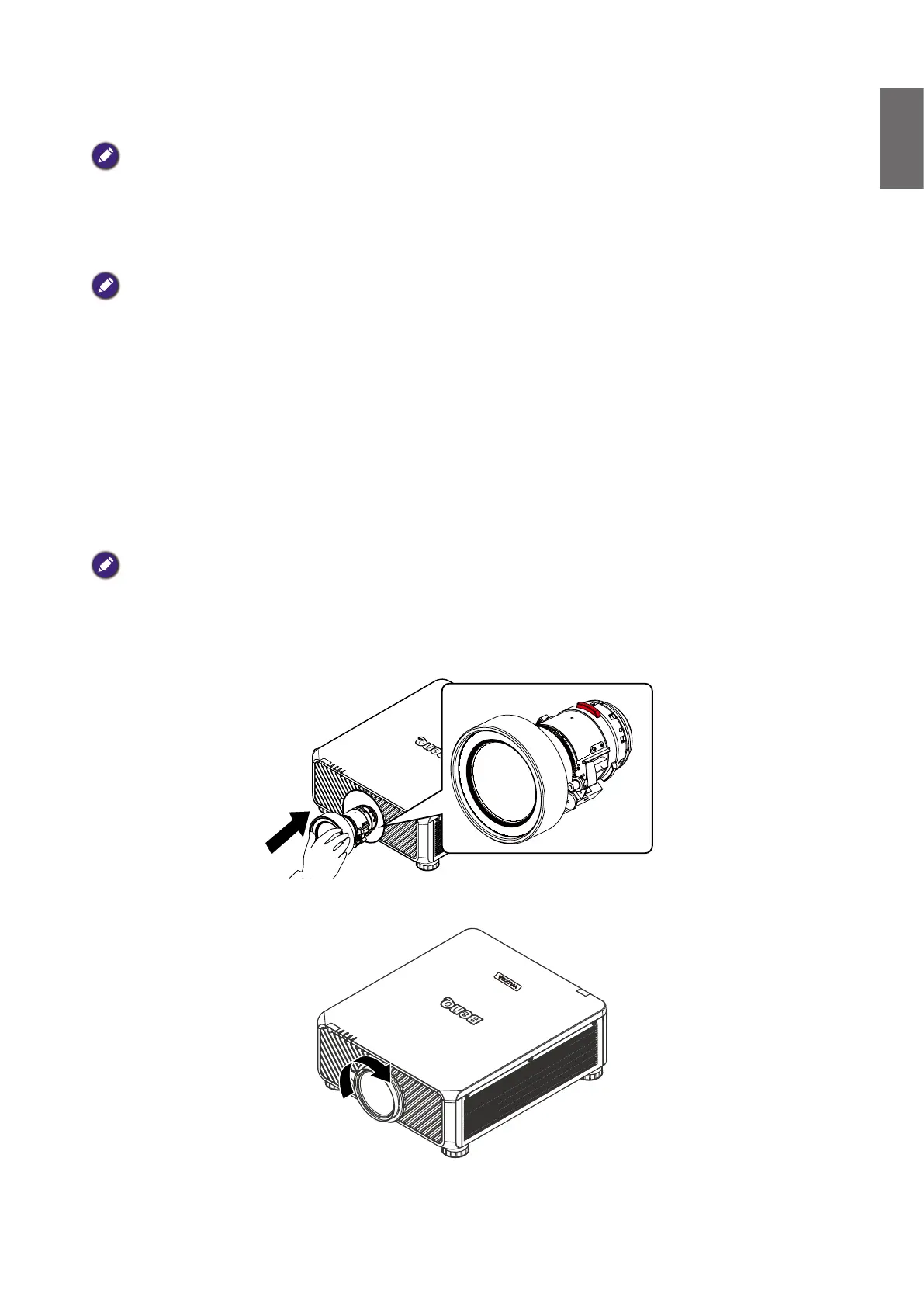 • Before removing or installing the lens, be sure to turn off the projector, wait until the cooling fans stop, and turn off