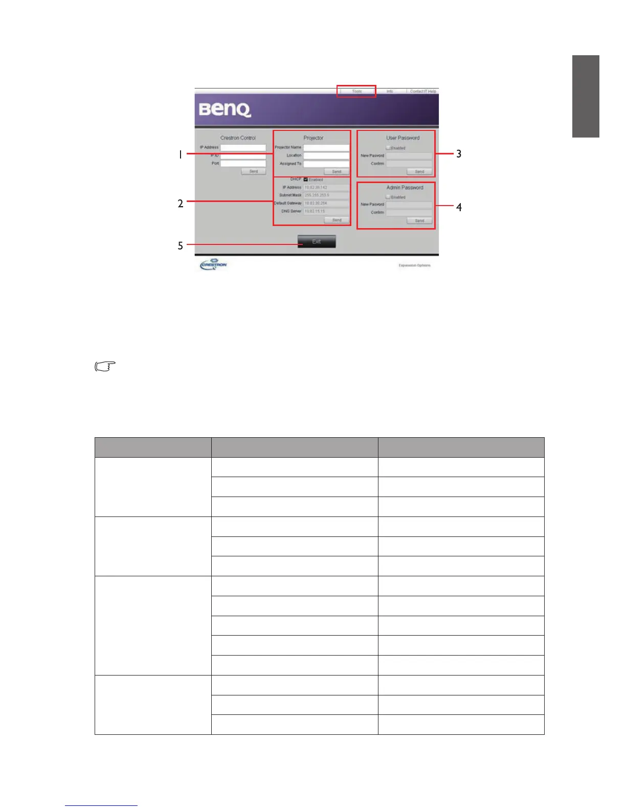 The tools page allows you to manage the projector, congure the LAN control settings and secure