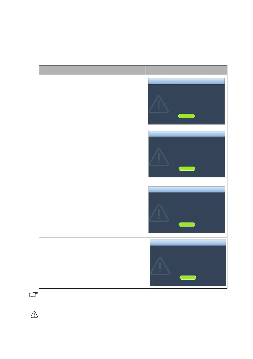 The following light source warning displays will remind you to change the light source.
