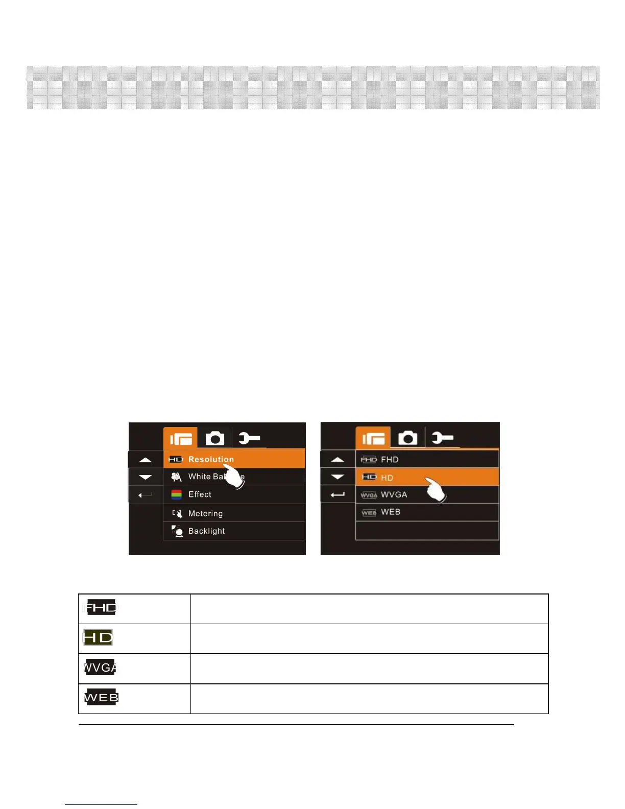 3. Press Up/Down Button to select FHD, HD, WVGA or WEB. Press