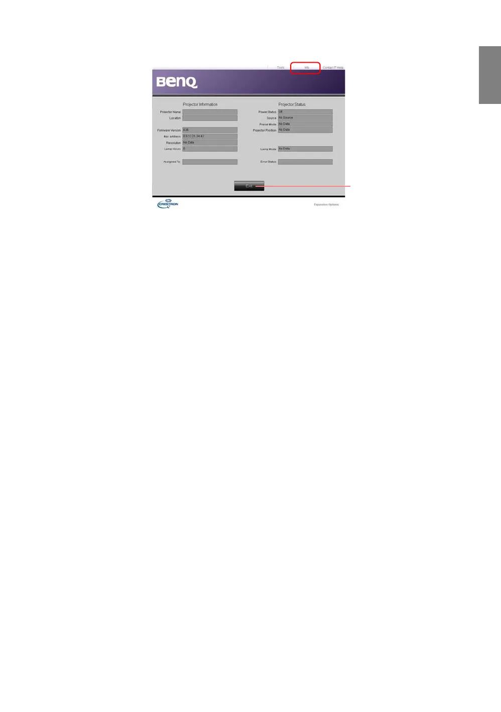 The info page displays the information and status of this projector.