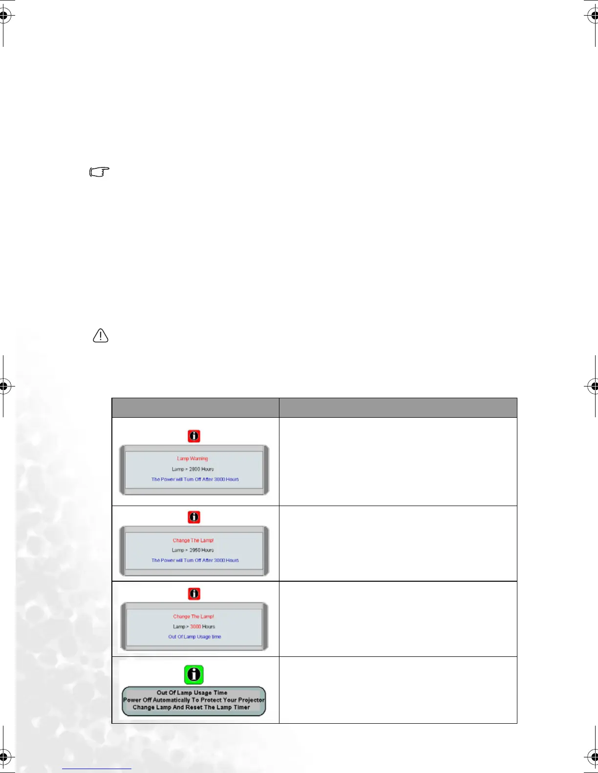 El siguiente mensaje de advertencia sobre la lámpara le recordará la necesidad de cambiarla.