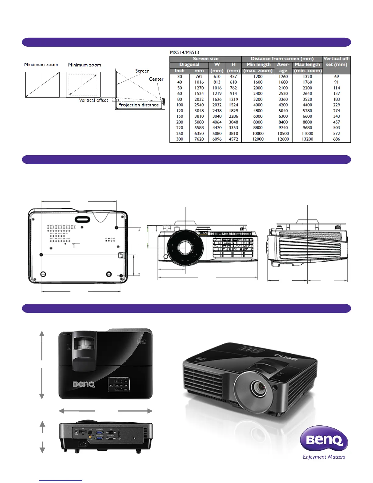 BenQ MS513 - Distance Chart; Mounting and Dimensions; Wall Mount Chart; Dimensions