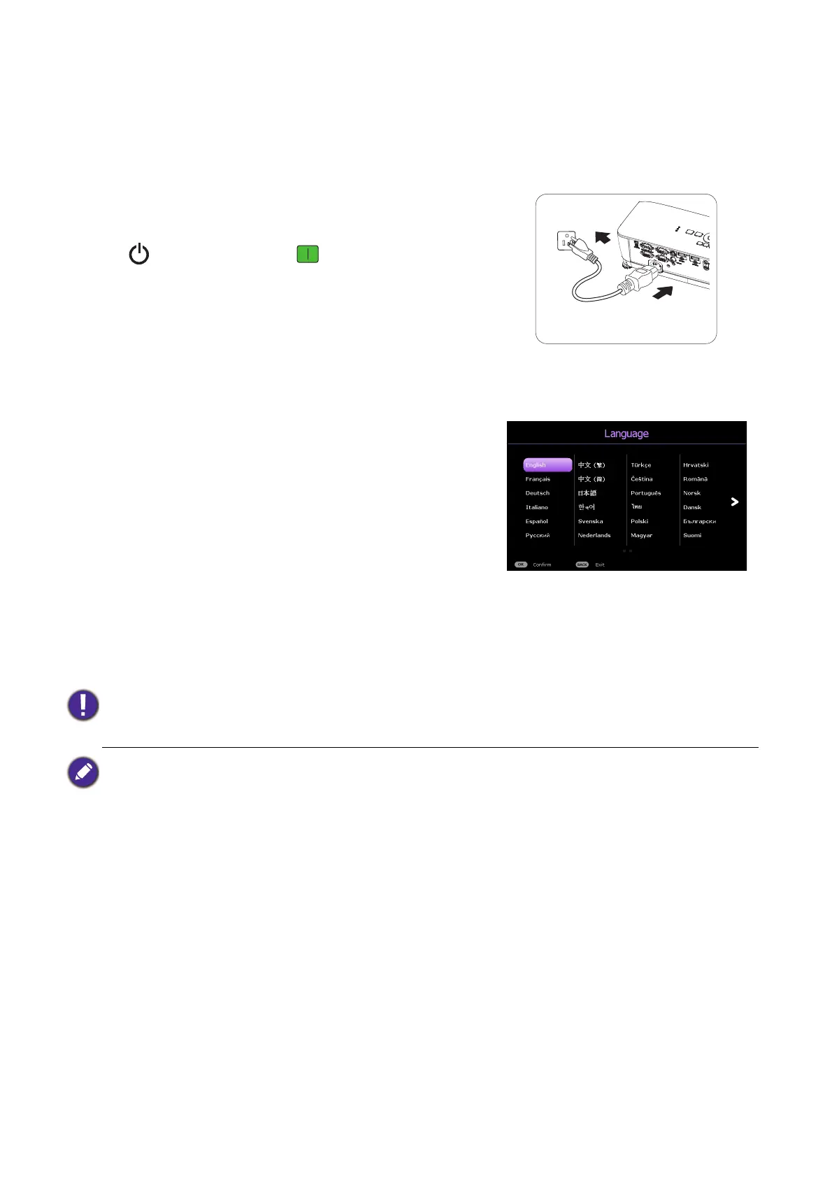 • If the projector is still hot from previous activity, it will run the cooling fan for approximately 90 seconds before