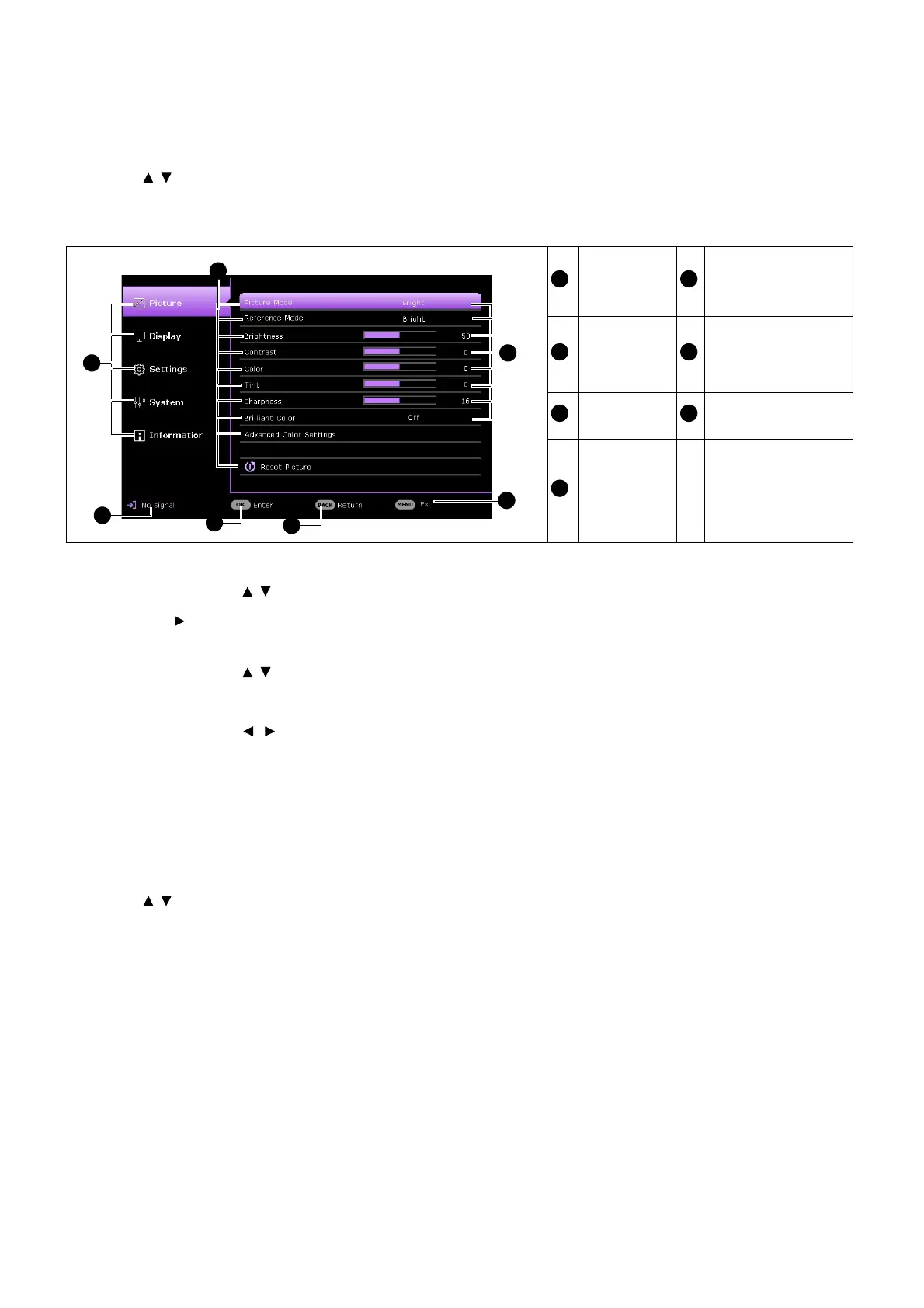 • Use the arrow keys ( / ) on the projector or remote control to make adjustments.