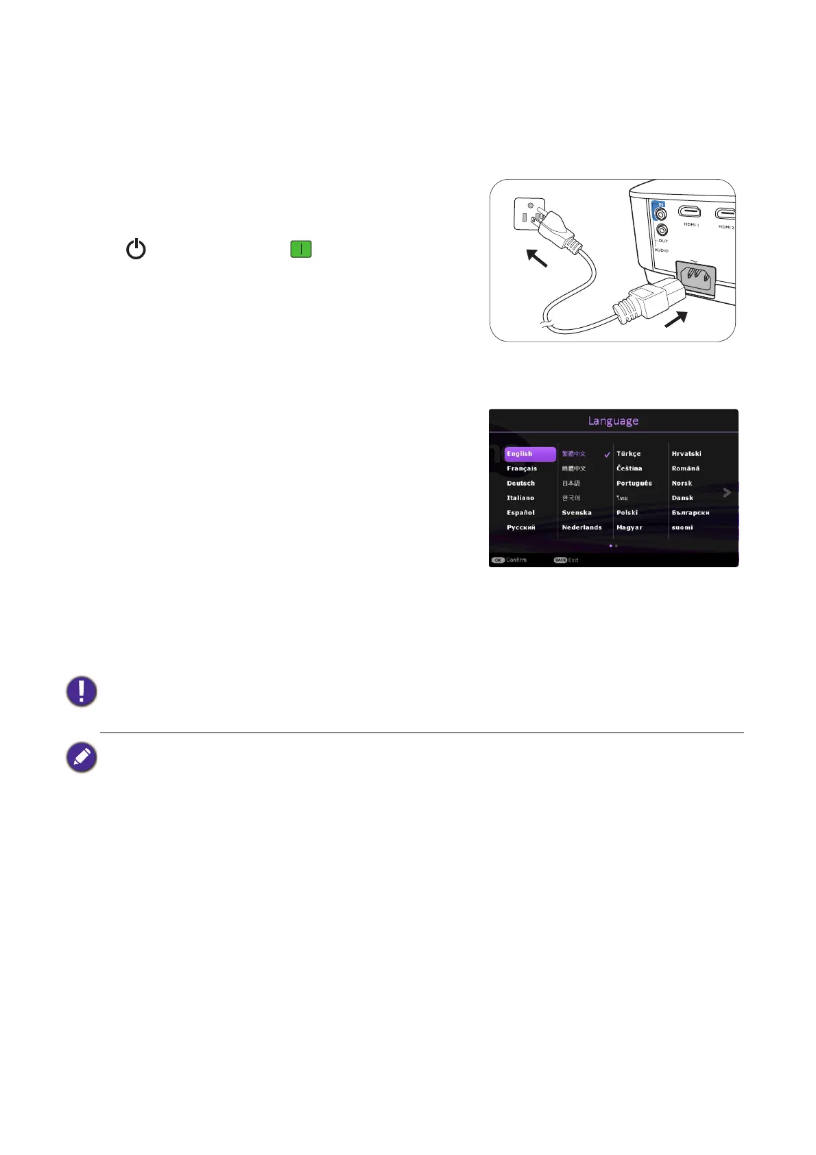 • If the projector is still hot from previous activity, it will run the cooling fan for approximately 90 seconds before