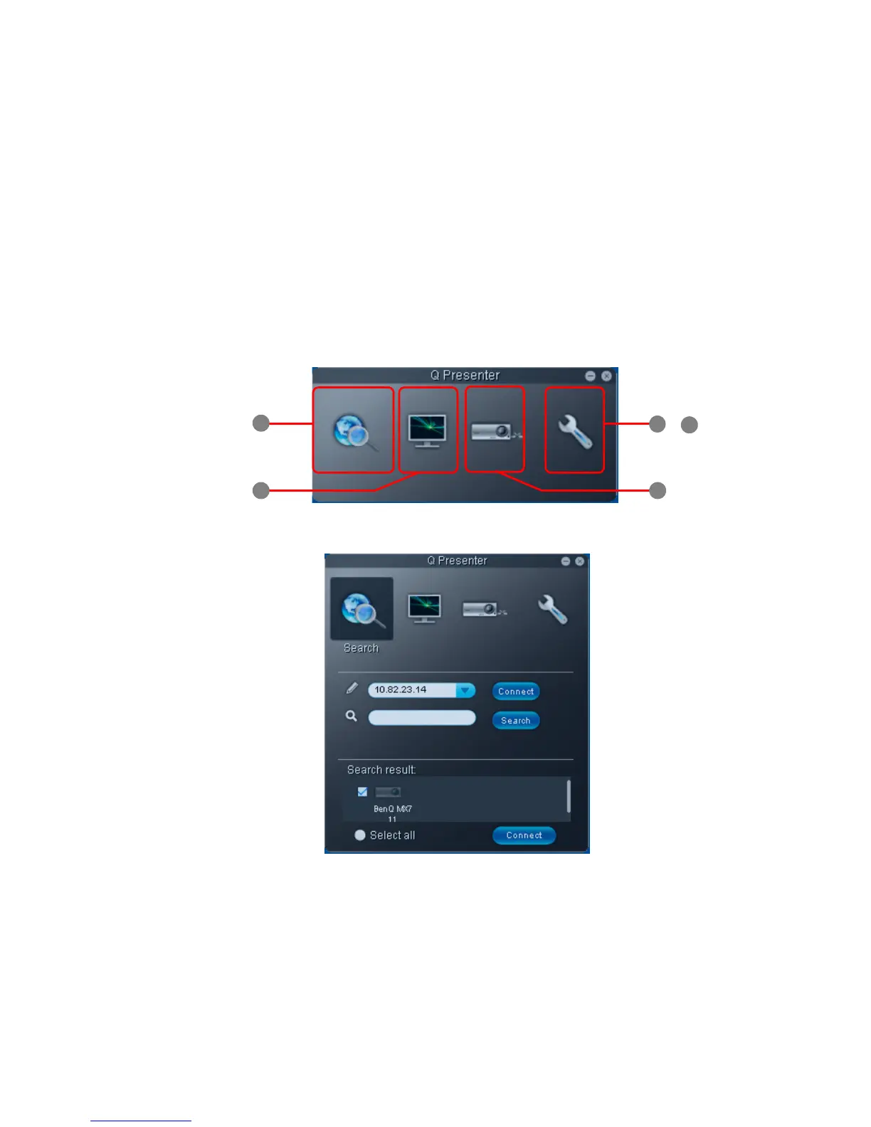 1. The Search page allows you to search and connect to a projector.