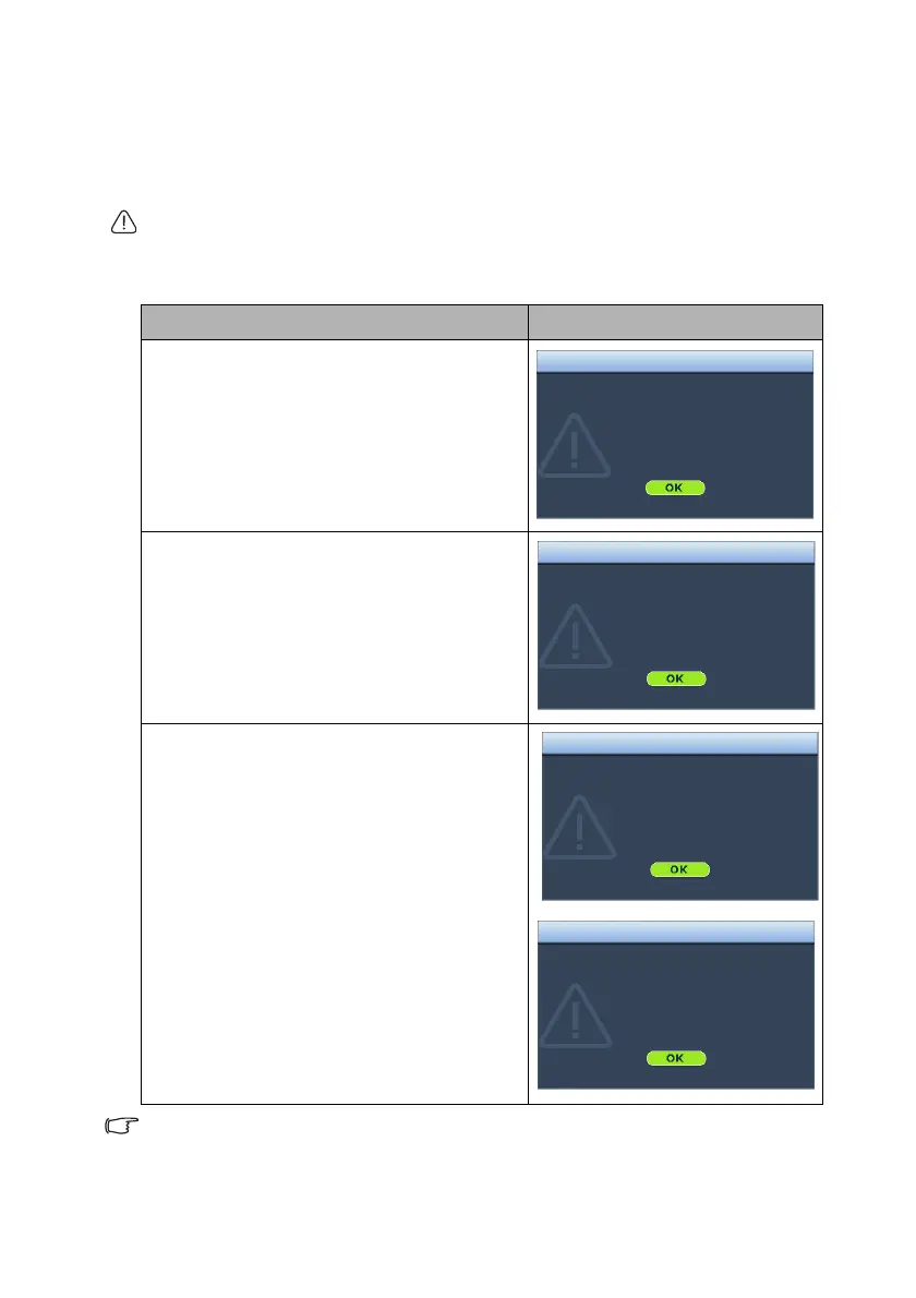 The following Lamp warning displays will remind you to change the lamp.