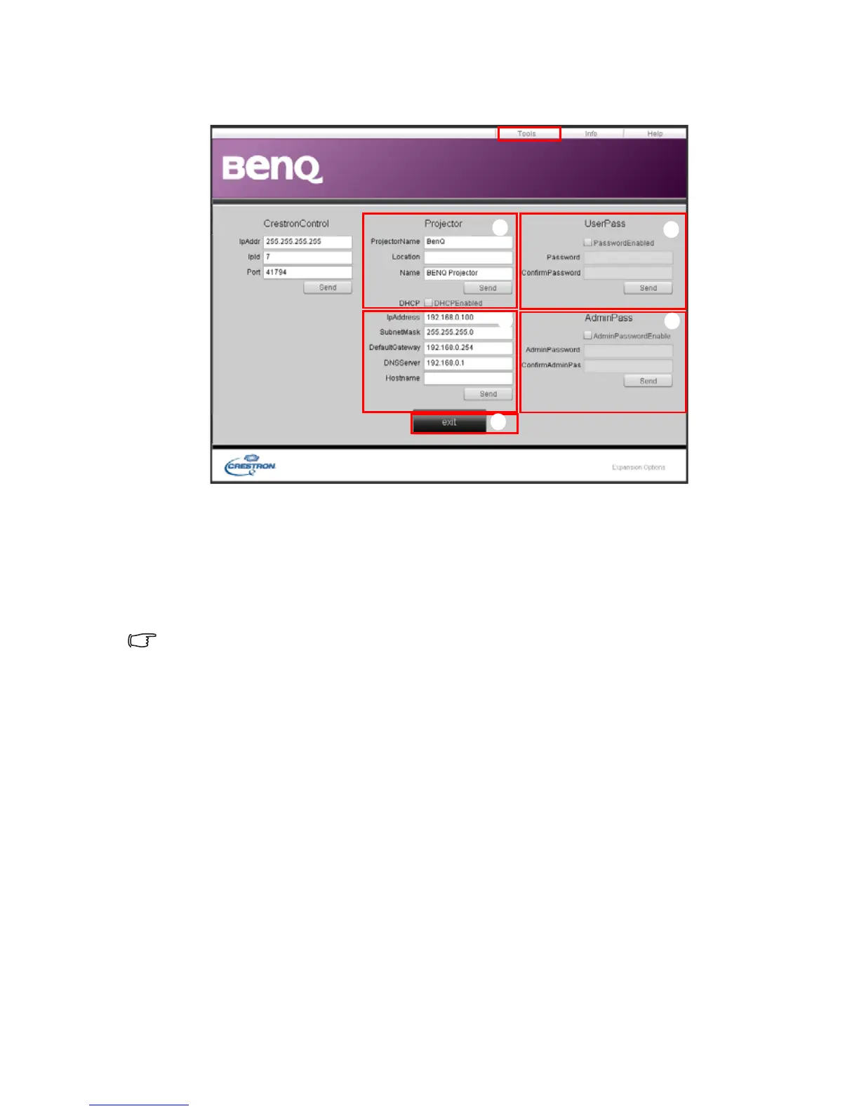 The tools page allows you to manage the projector, configure the LAN control settings and