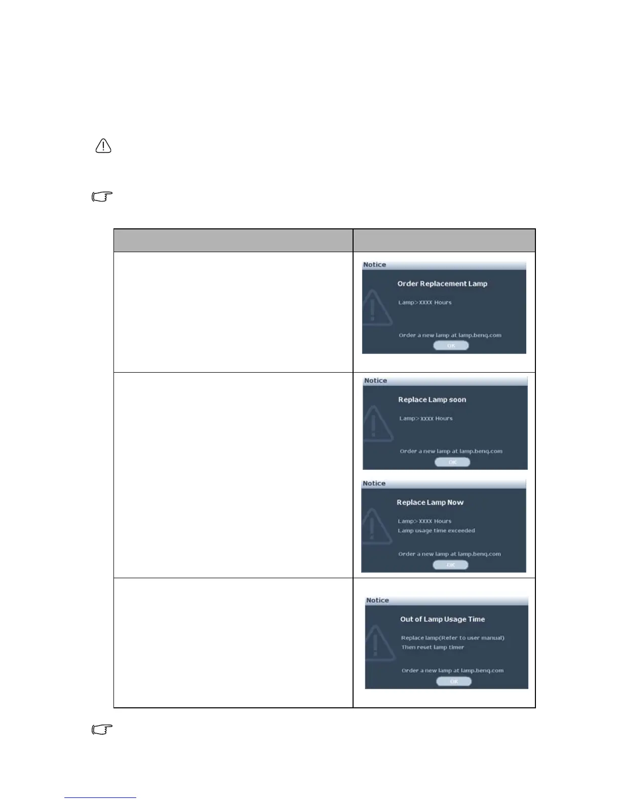 The following lamp warning displays will remind you to change the lamp.