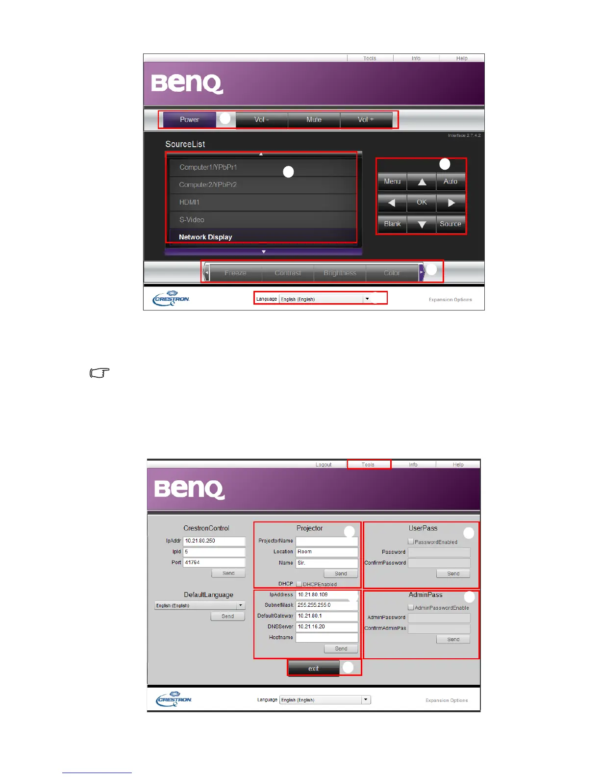The tools page allows you to manage the projector, configure the LAN control settings and