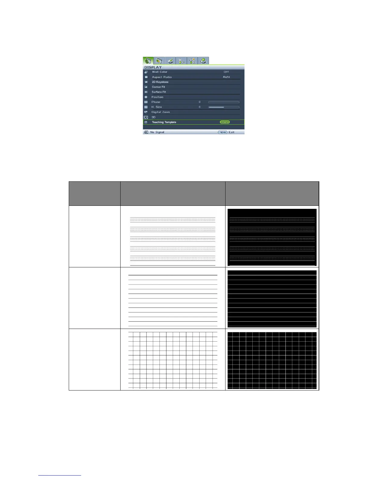 Open the OSD menu and go to the DISPLAY > Teaching Template . Choose