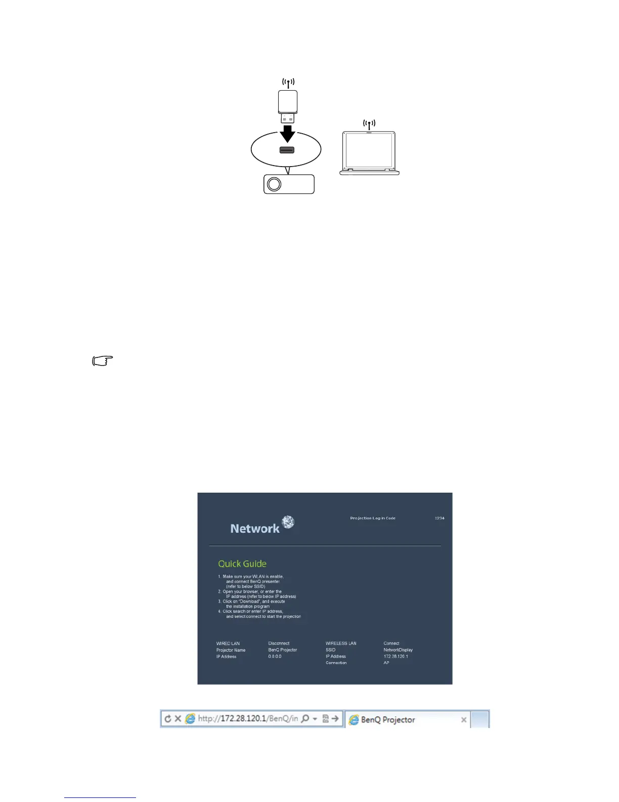 1. Connect the BenQ wireless dongle (optional) to the USB TYPE-A input jack of the