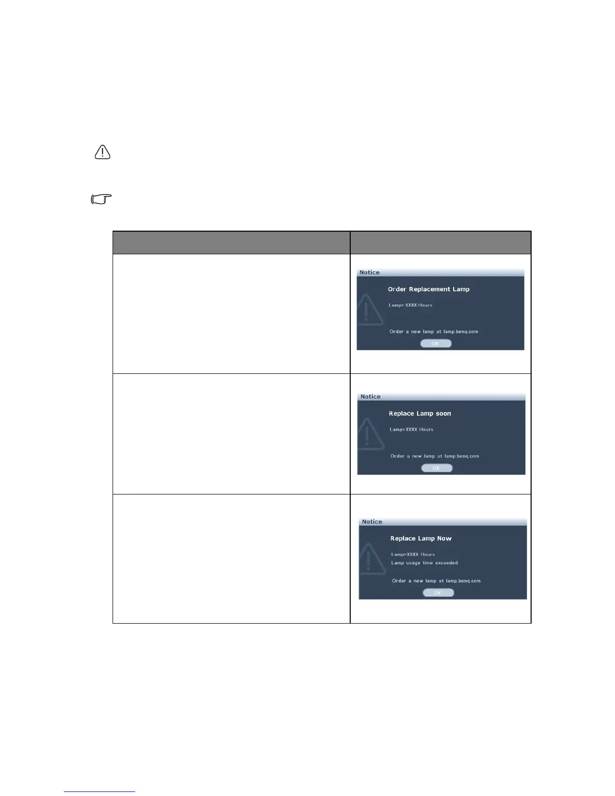 The following lamp warning displays will remind you to change the lamp.